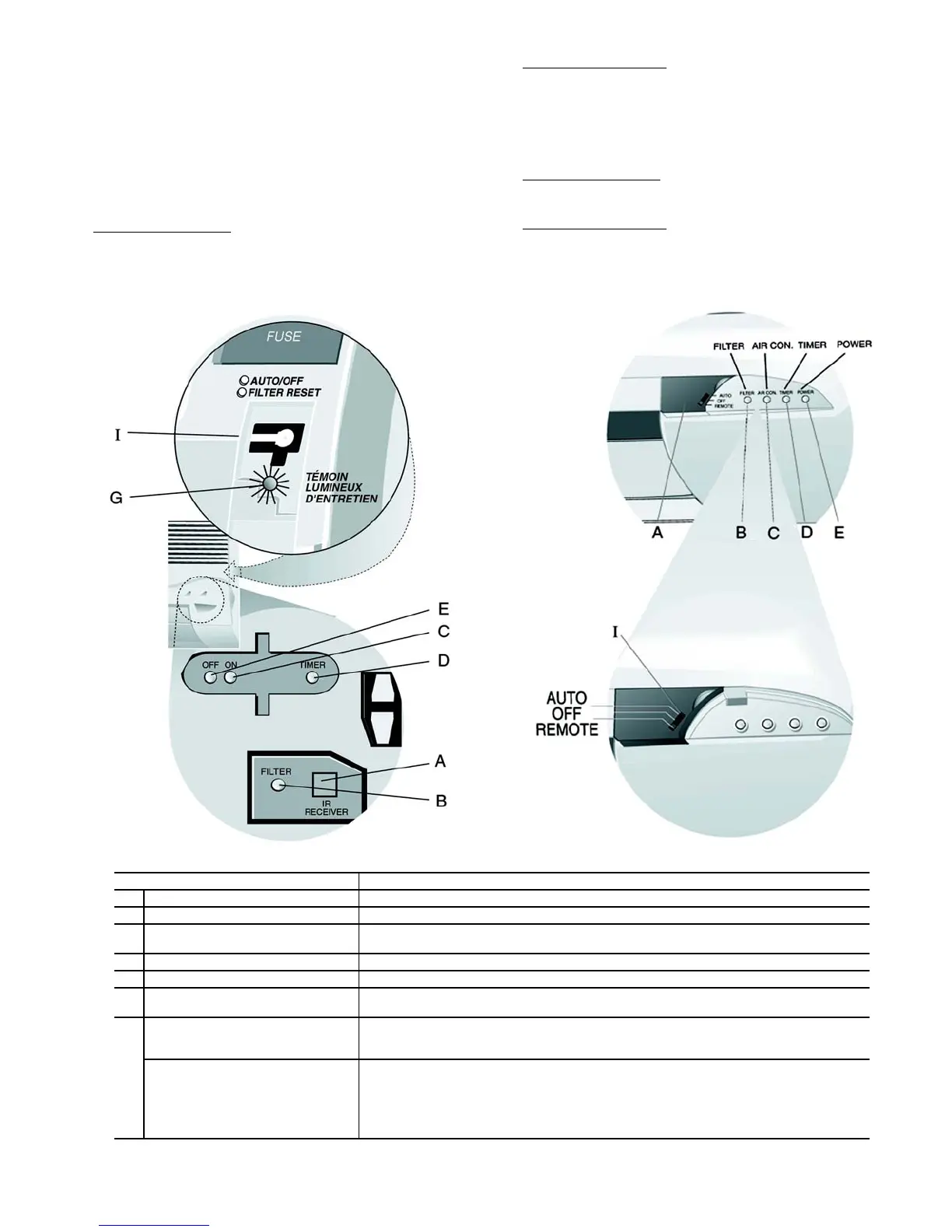 E Indicateur lumineux d'alimentation S’allume lorsque le climatiseur est branché sur une prise électrique du voltage approprié.