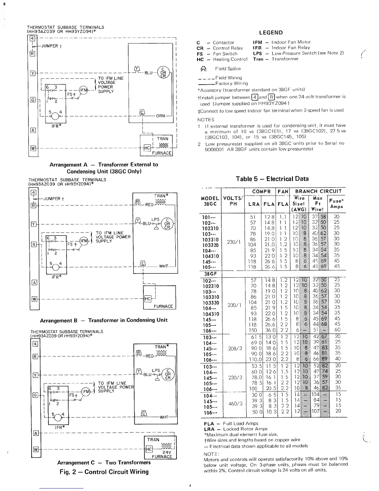 Carrier 38GF - Electrical Data; Transformer External to Condensing Unit; Transformer in Condensing Unit; Control Circuit Wiring