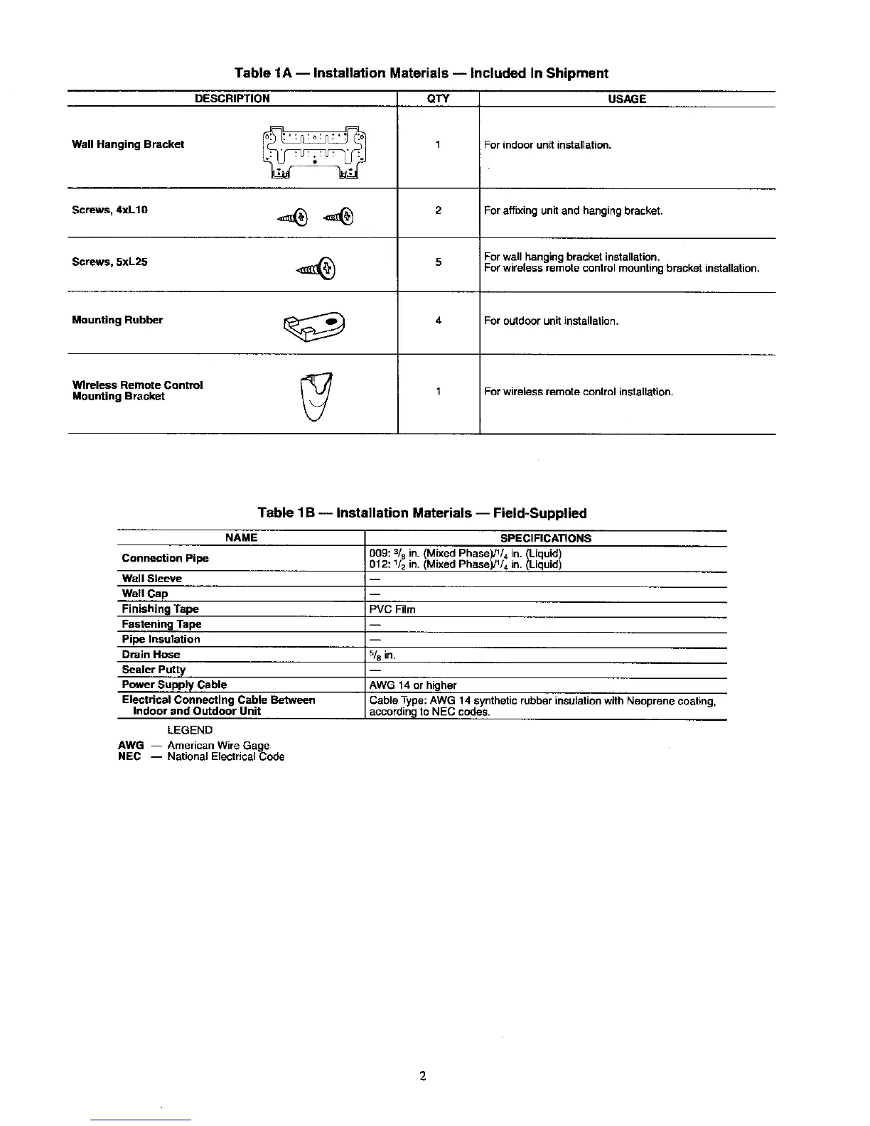Table 1B-- Installation Materials -- Field-Supplied