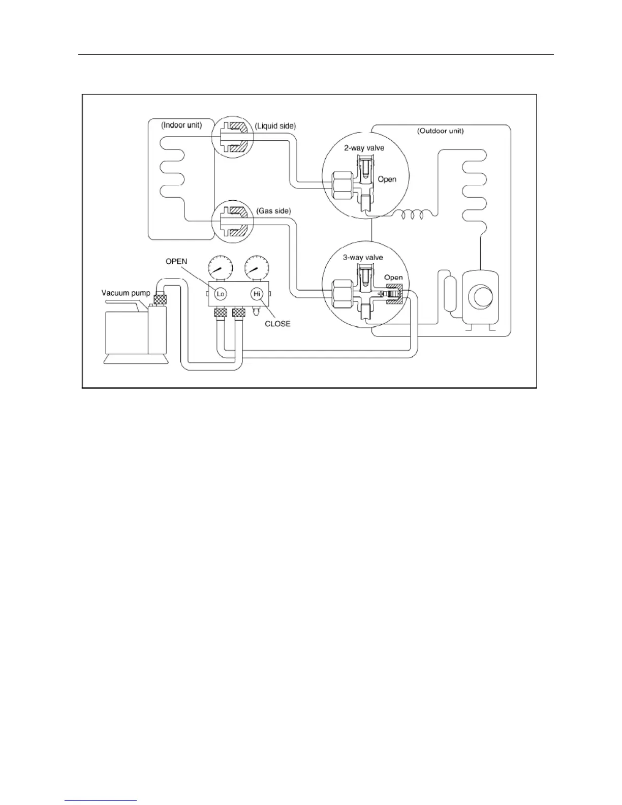 Close the valve (Low side) on the charge set, turn off the vacuum pump, and confirm that the gauge needle does