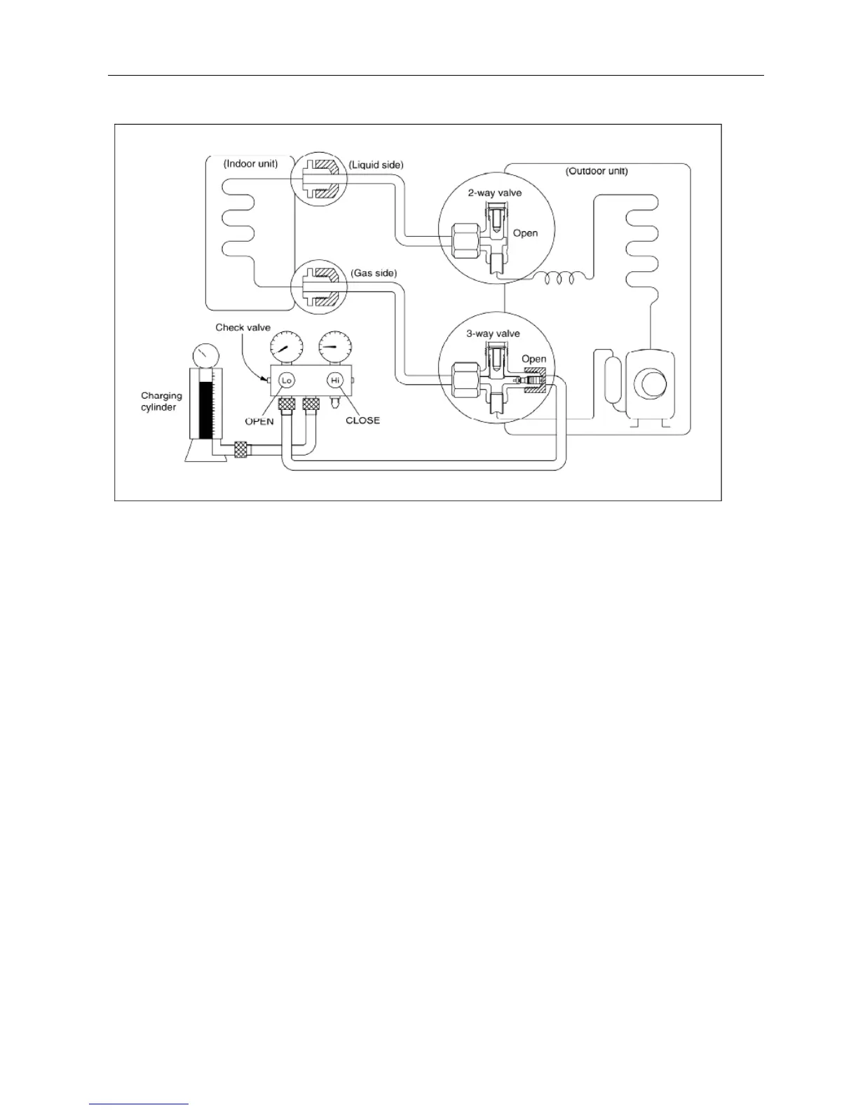 3. Open the valves (Low side) on the charge set and charge the system with liquid refrigerant.