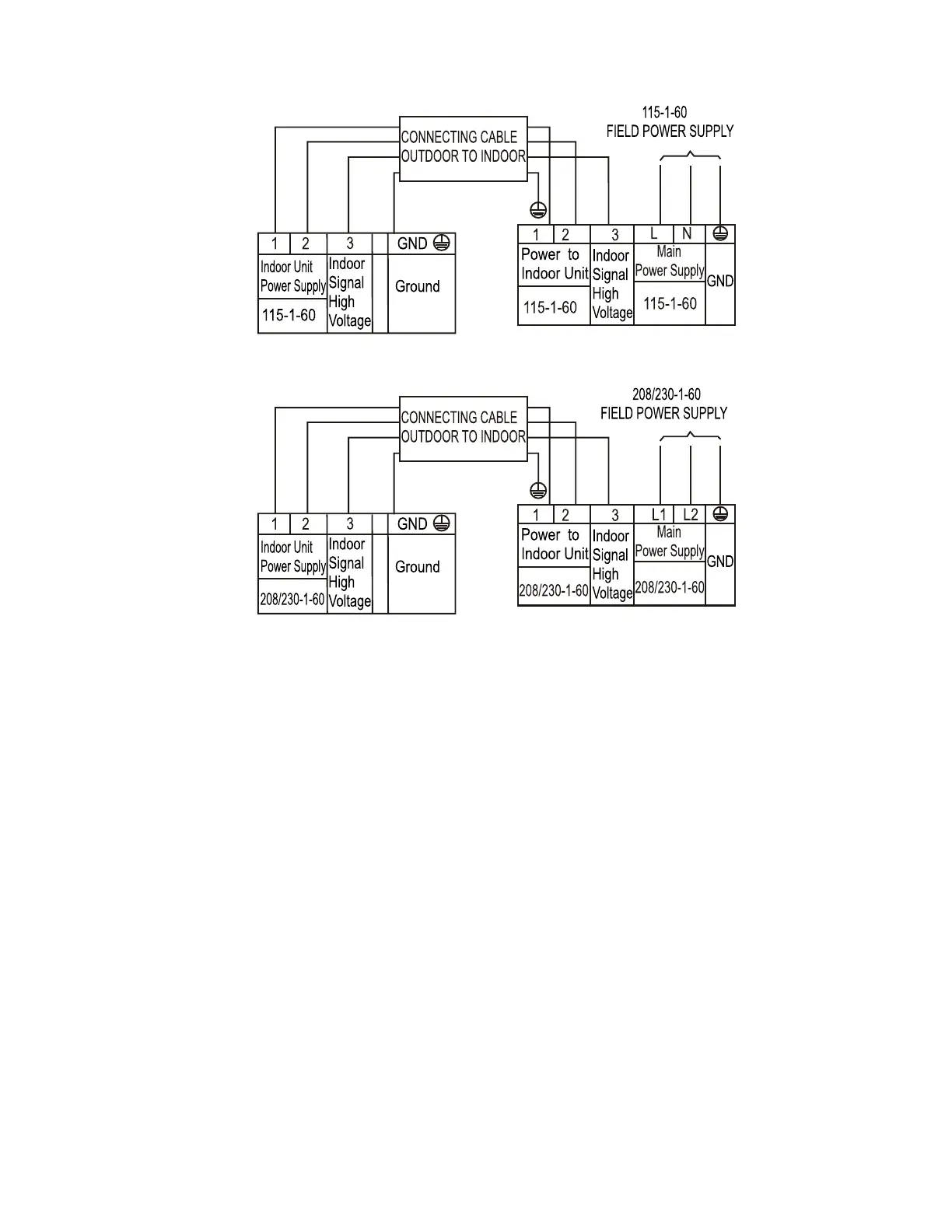 2. All connections between the indoor and outdoor units must be made as shown in Figures 7 - 8. The connections are sensitive to polarity and will