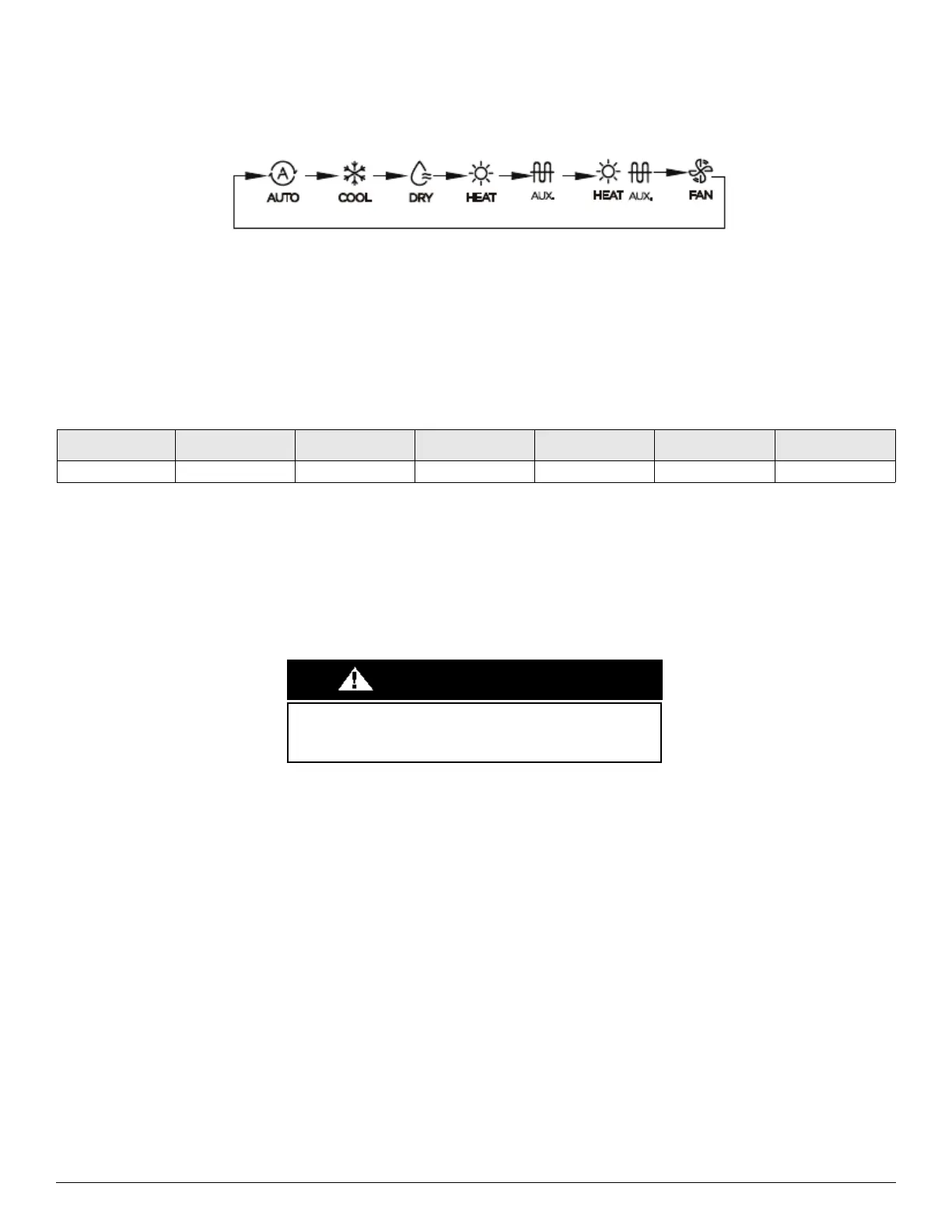 2. Each press will change the mode of operation: Auto/Cool/Dry/Heat (heat pump only)/AUX (furnace only)/Heat/ AUX (Dual Fuel)/Fan