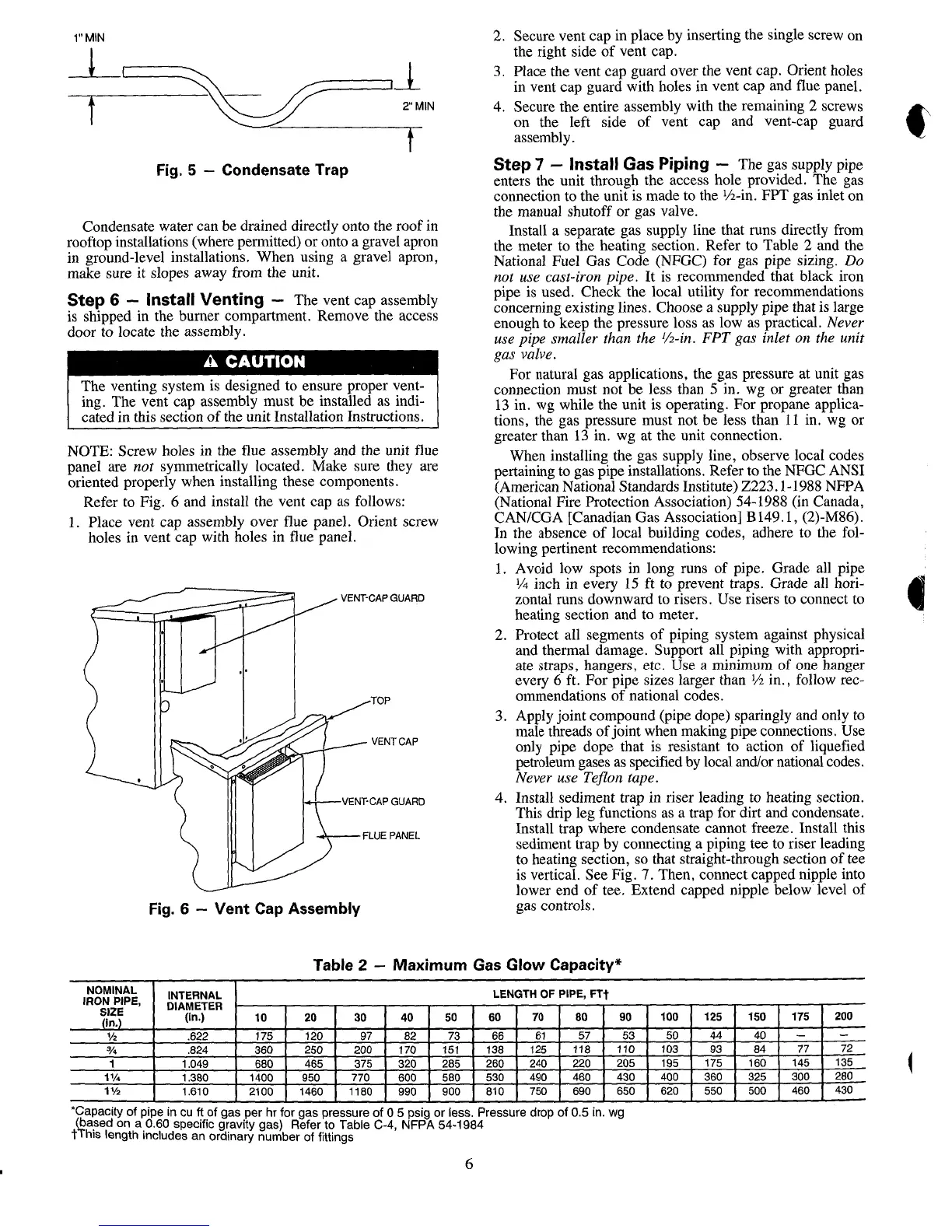 Carrier 48NET - Install Venting; Install Gas Piping; Vent Cap Assembly; Maximum Gas Glow Capacity