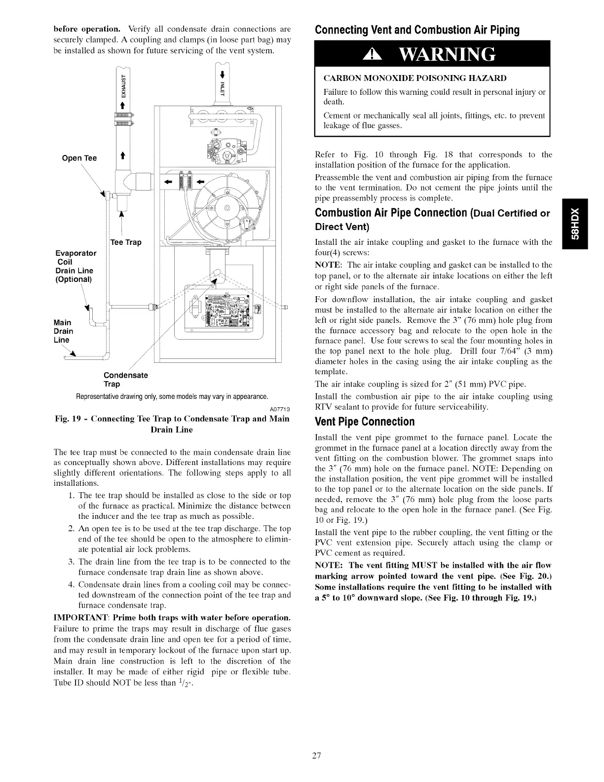 Carrier 58HDX - Connecting Vent and Combustion Air Piping; Combustion Air Pipe Connection (Dual Certified or Direct Vent); Vent Pipe Connection