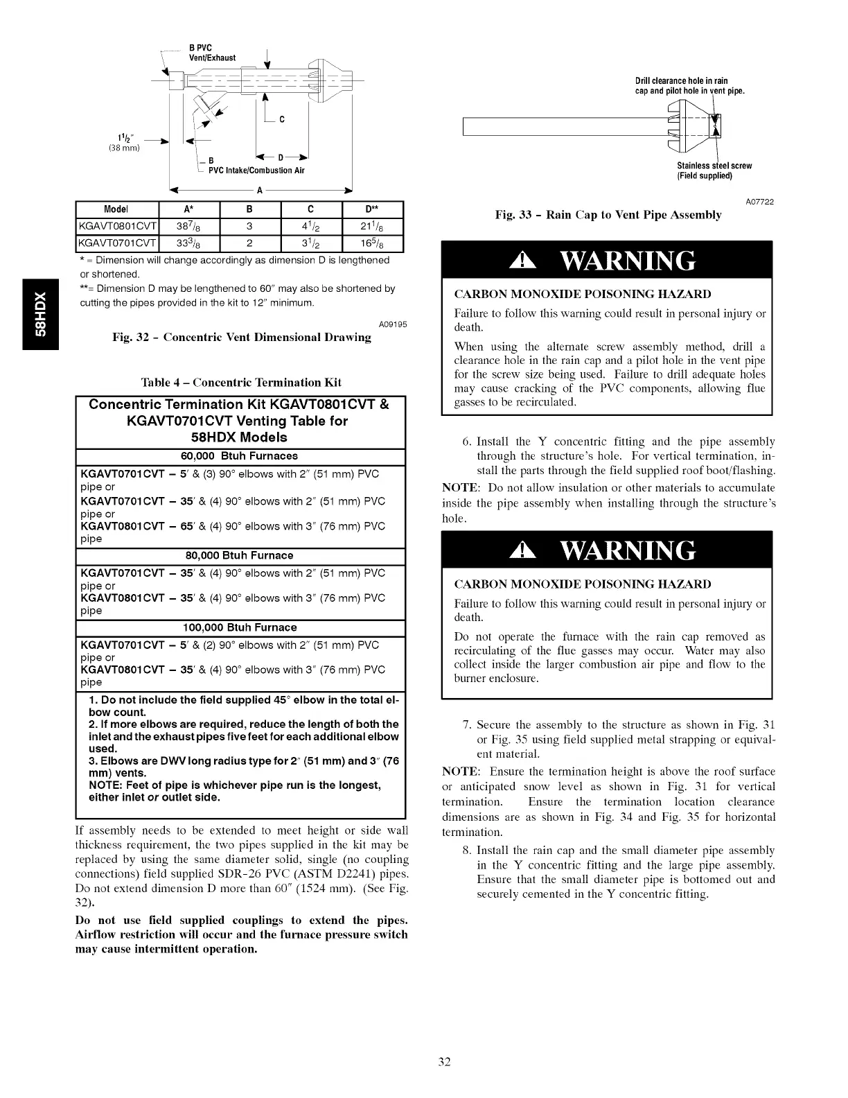 Carrier 58HDX - Concentric Vent Termination Kit Installation; Carbon Monoxide Poisoning Hazard (Alternate Assembly); Rain Cap Removal Hazard