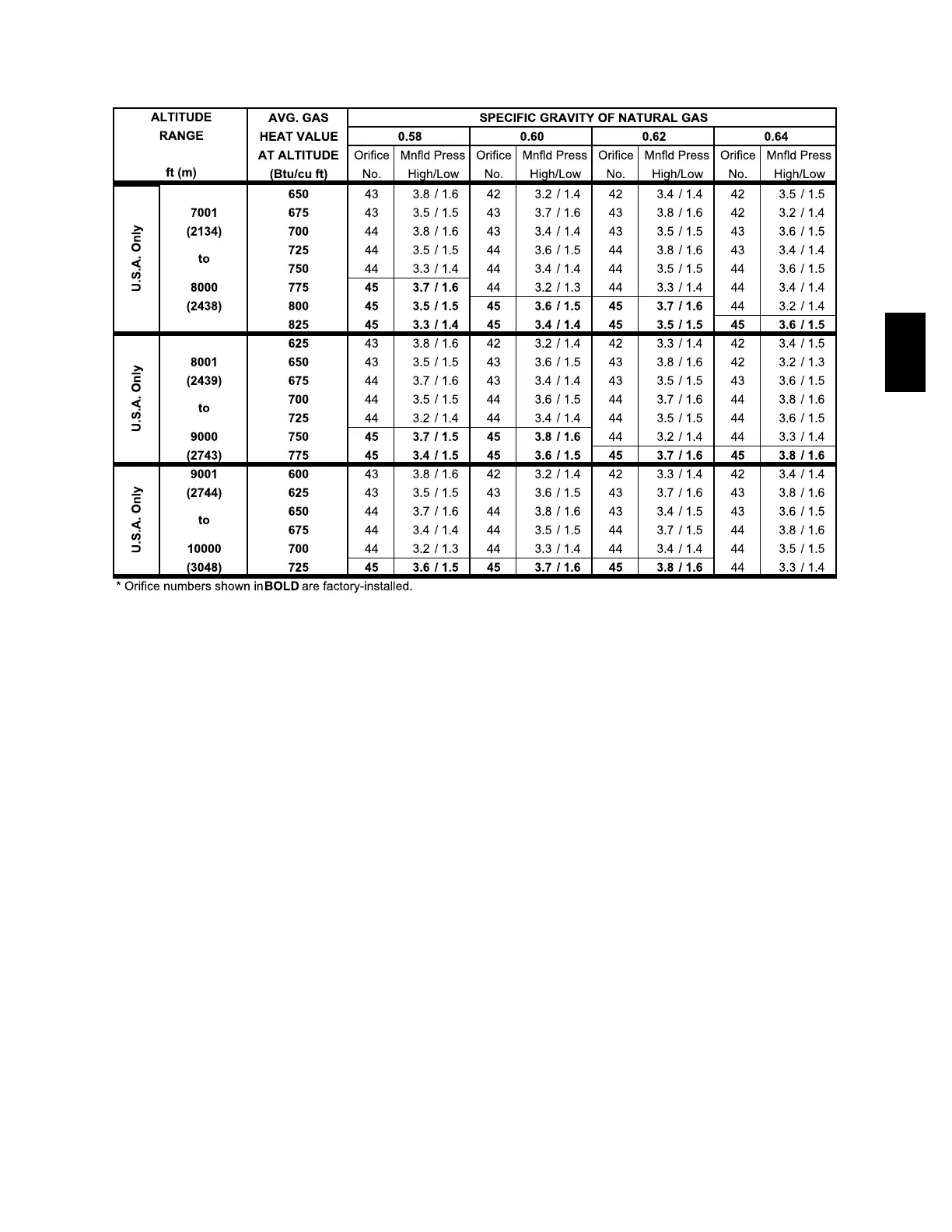 Table 15 --- Model 58MEC Orifice Size and High/Low-Heat Manifold Pressures for Correct Inputs (Continued)