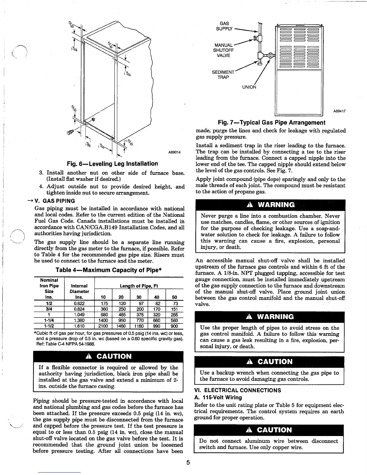 Carrier 58SSC - Gas Piping and Electrical Connections; Gas Piping Installation and Sizing; 115-Volt Electrical Wiring