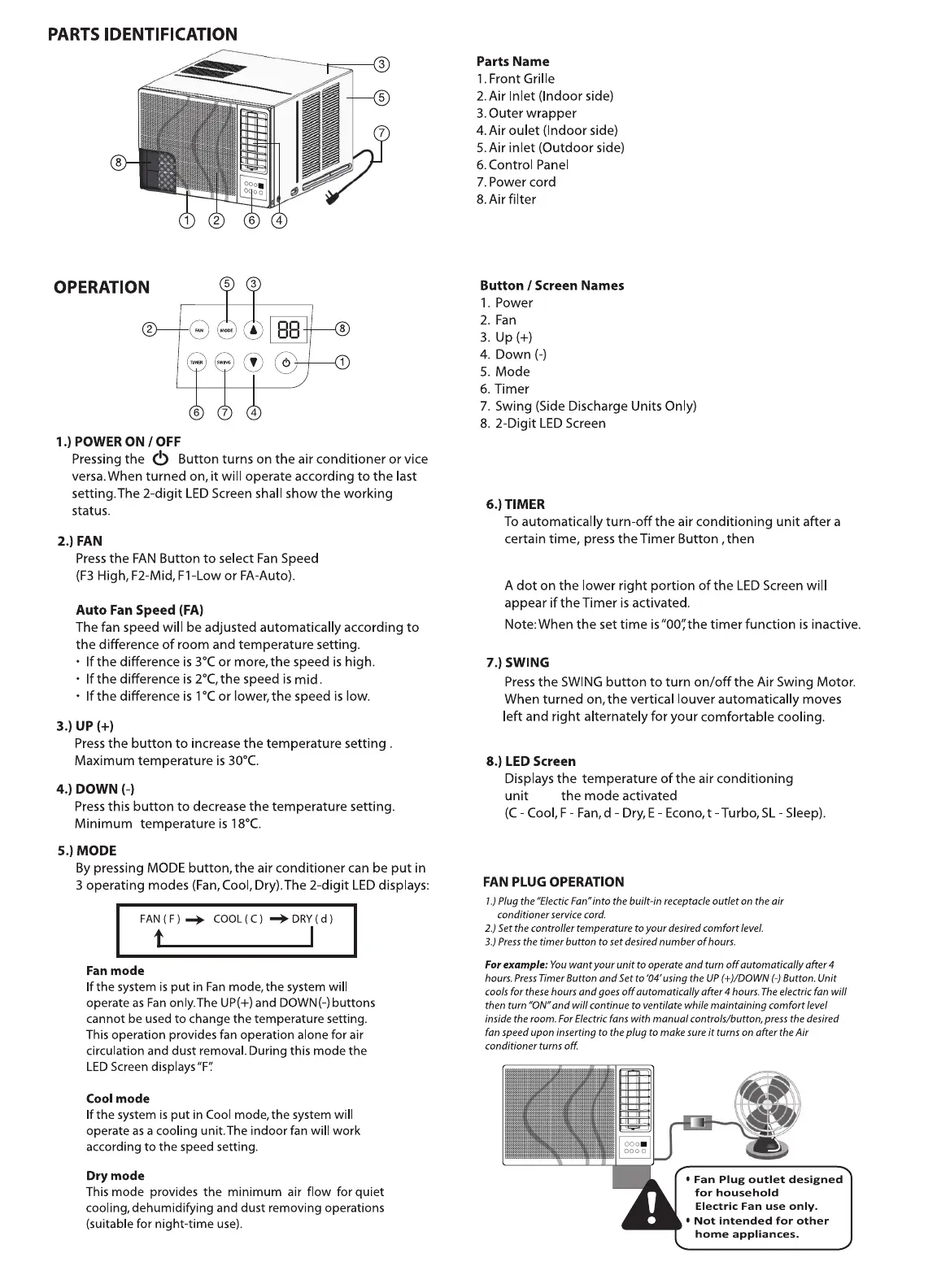 Carrier Aura - Parts Identification and Operation; Parts List; Power ON; OFF; Fan Speed Control
