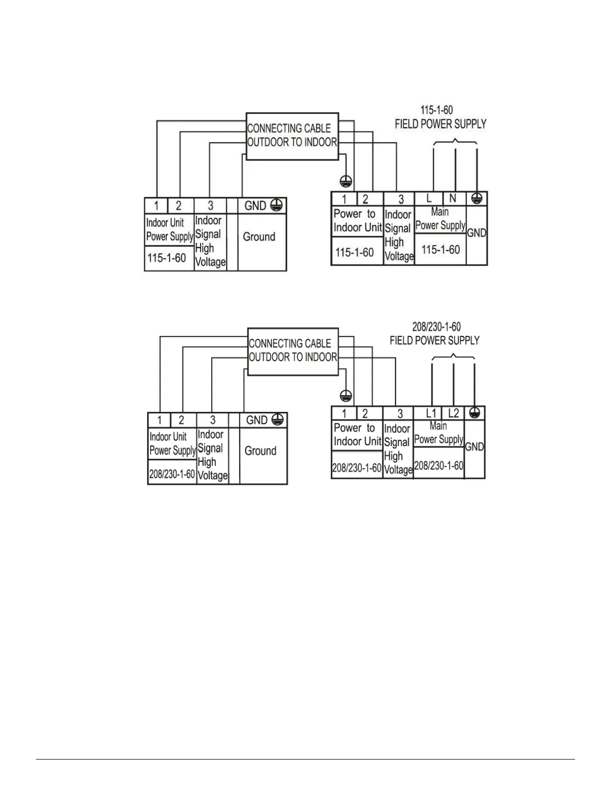 2. All connections between the indoor and outdoor units must adhere to the connections shown in Figures 3 and 4. The connections are polarity