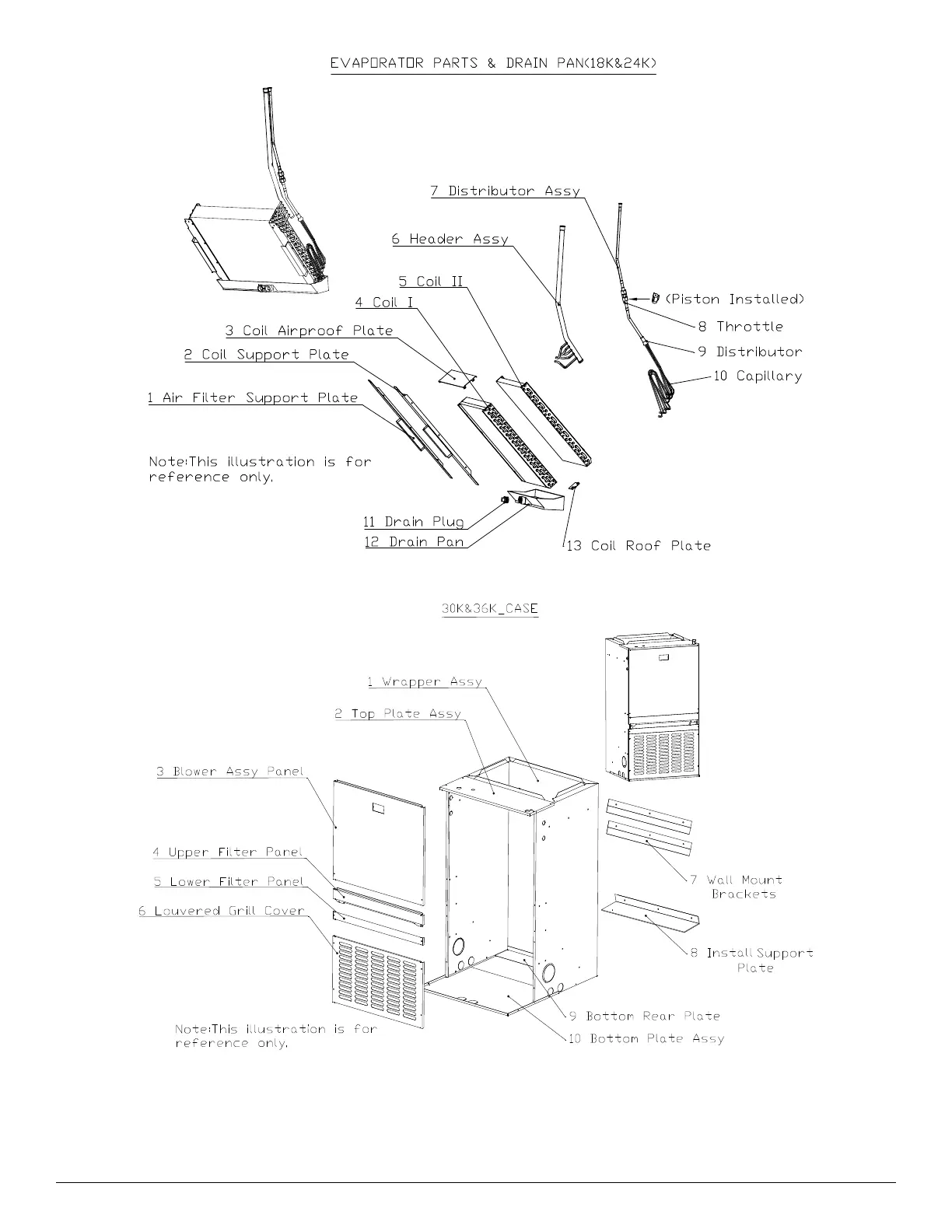 Fig. 19 – FMA4, FMA5, WAMA, WAXA (Sizes 18 & 24) Expanded View - Evaporator Parts & Drain Pan