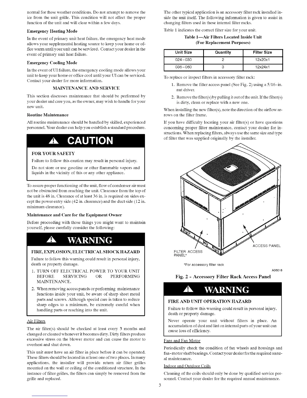 Table I---Air Filters Located Inside Unit