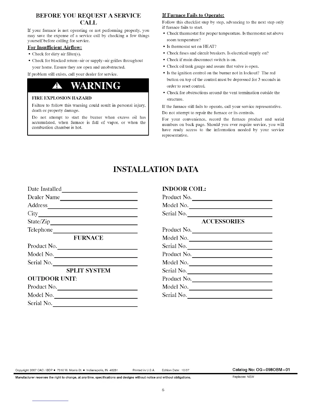 For your convenience, record the furnace product and serial