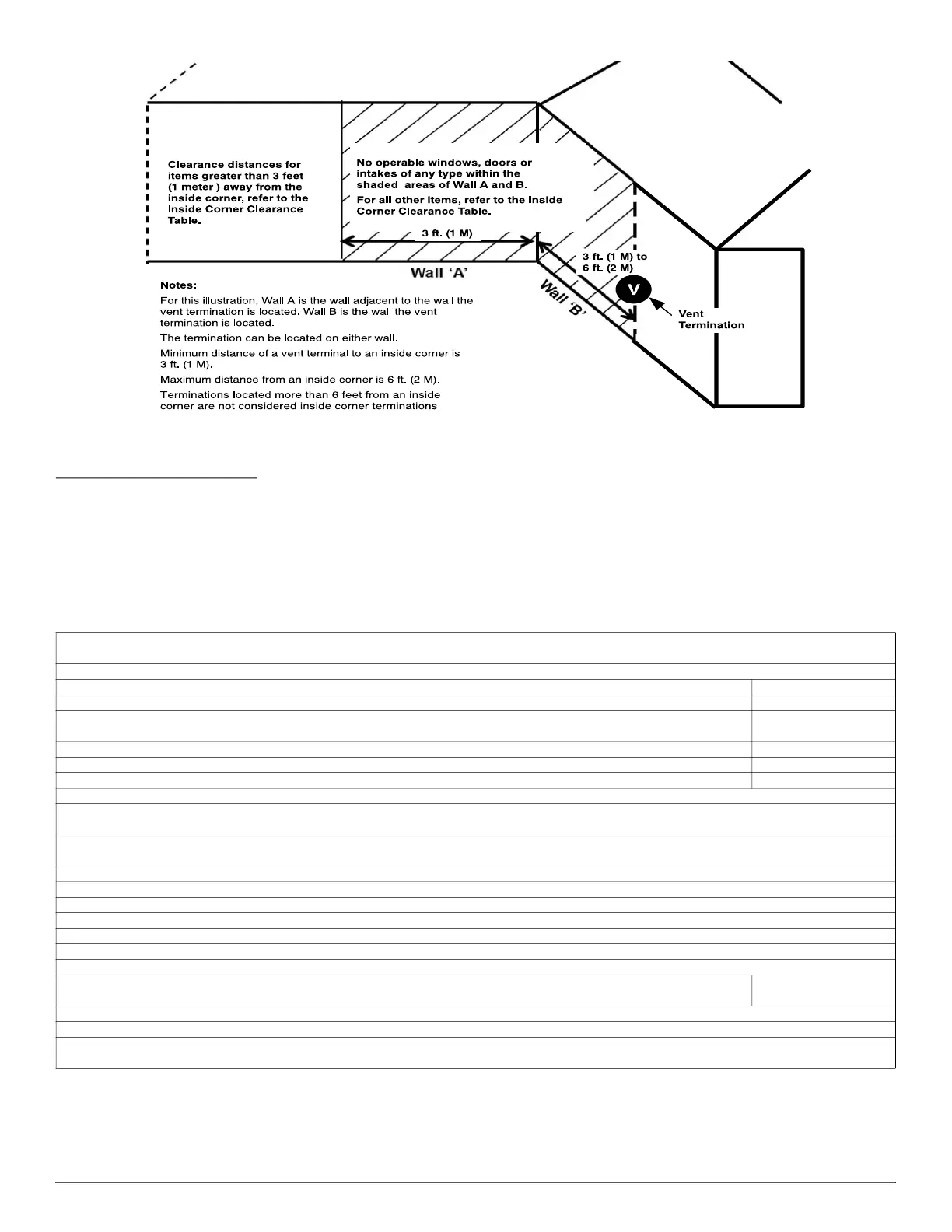 • The clearance distances to items between the vent termination and the outside corner, refer to the appropriate Direct Vent Clearance Table for all two
