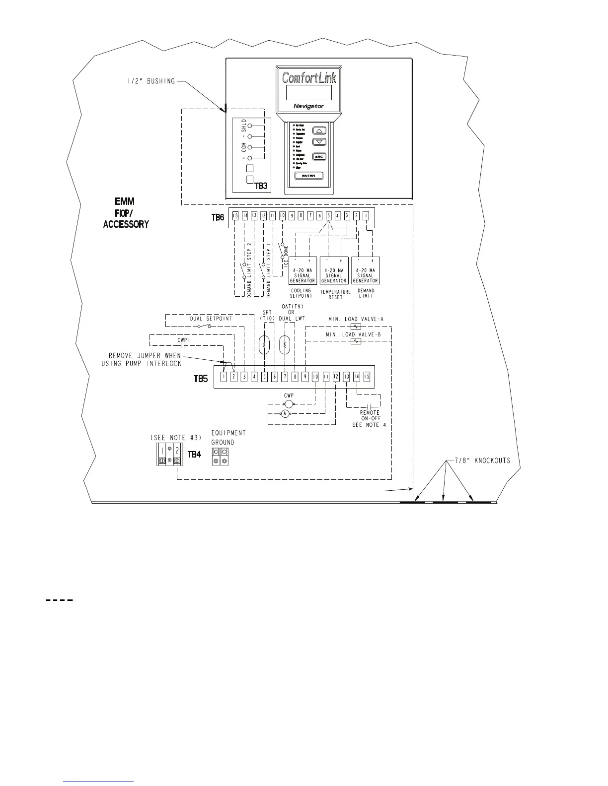 3. Terminals 1 and 2 of TB5 are for Chilled Water Pump Interlock (CWPI) functions. If