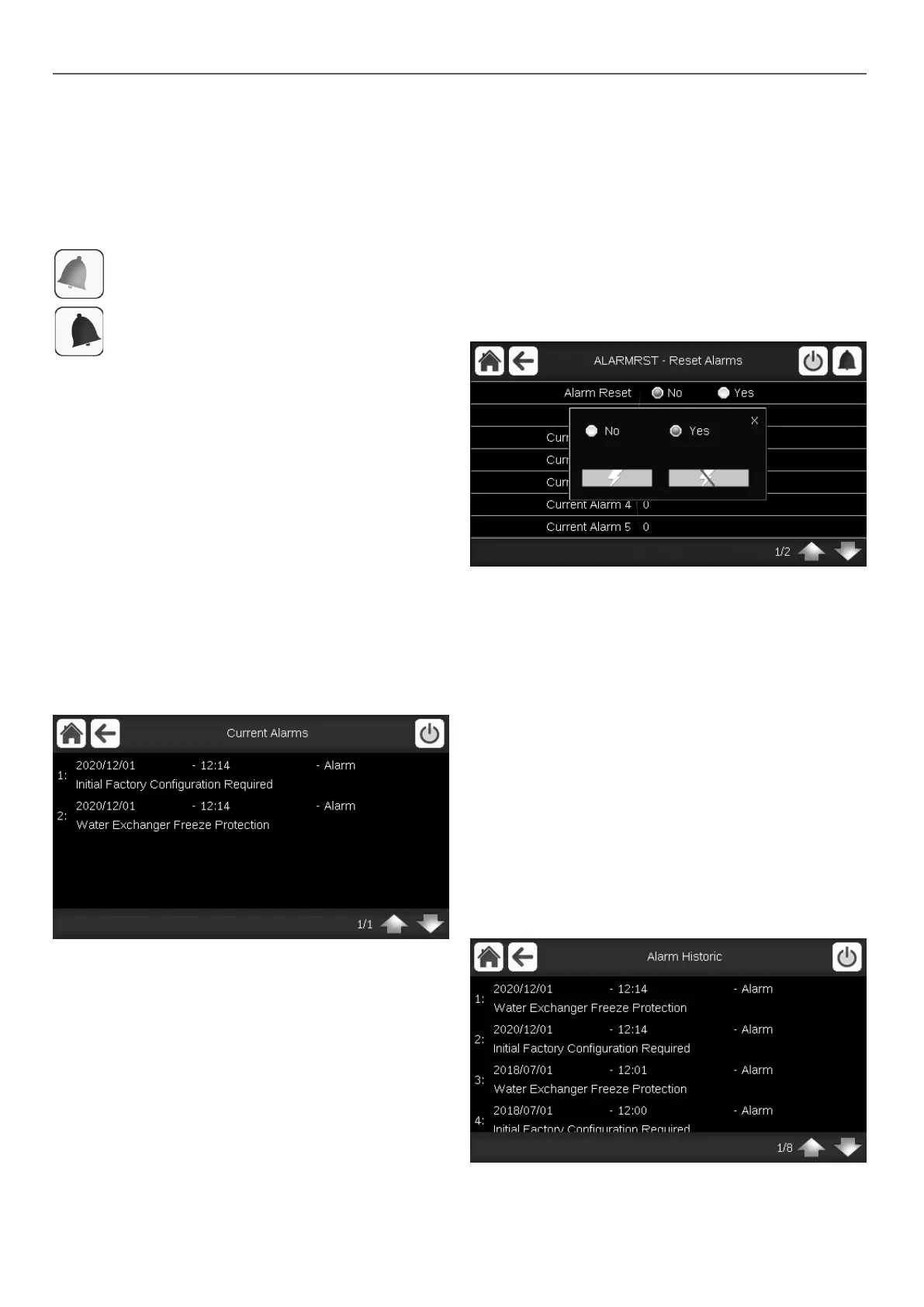 ■ The Reset alarms menu displays up to 5 alarm codes which