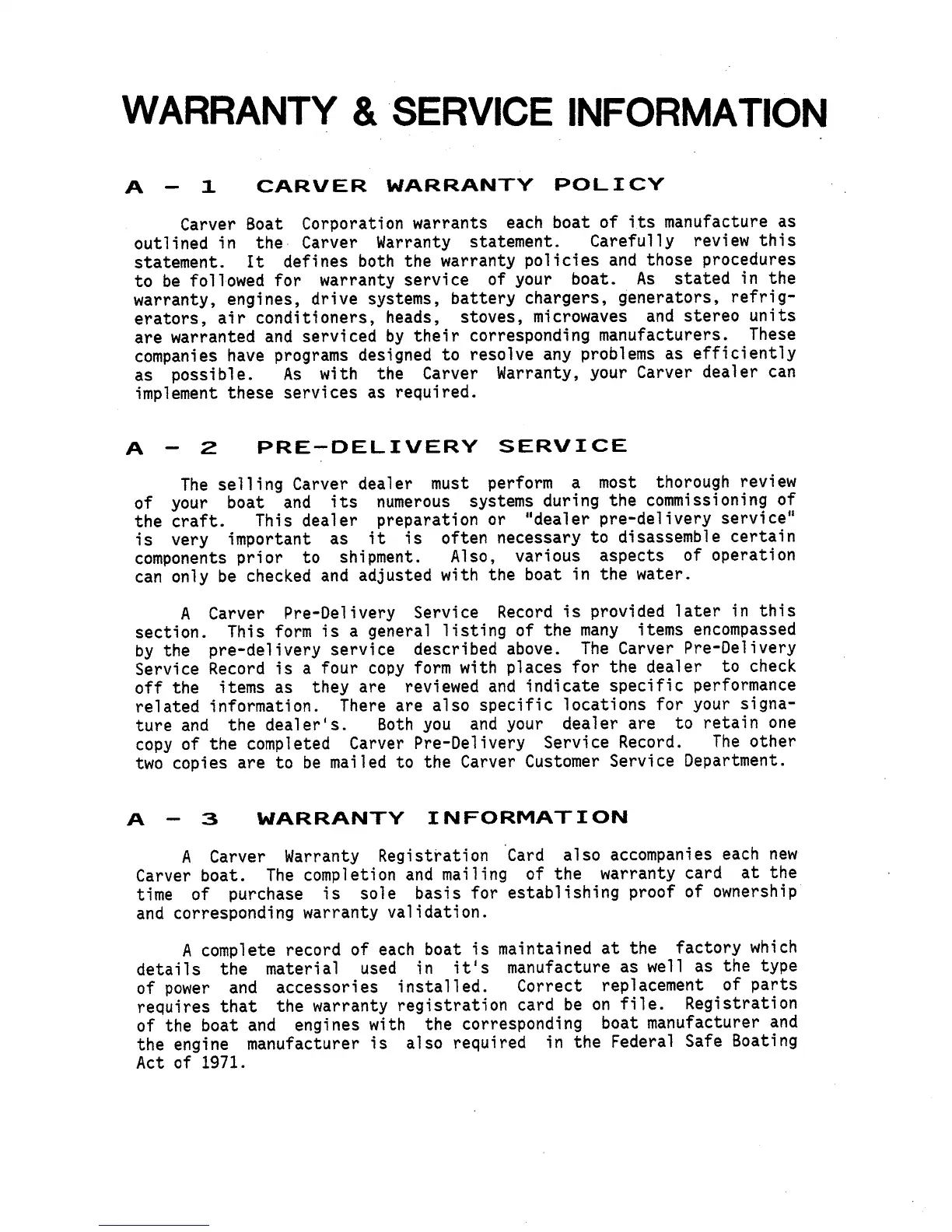 Carver 2767 - Article A-1 Carver Warranty Policy; Article A-2 Pre-Delivery Service; Article A-3 Warranty Information; Electrical Systems