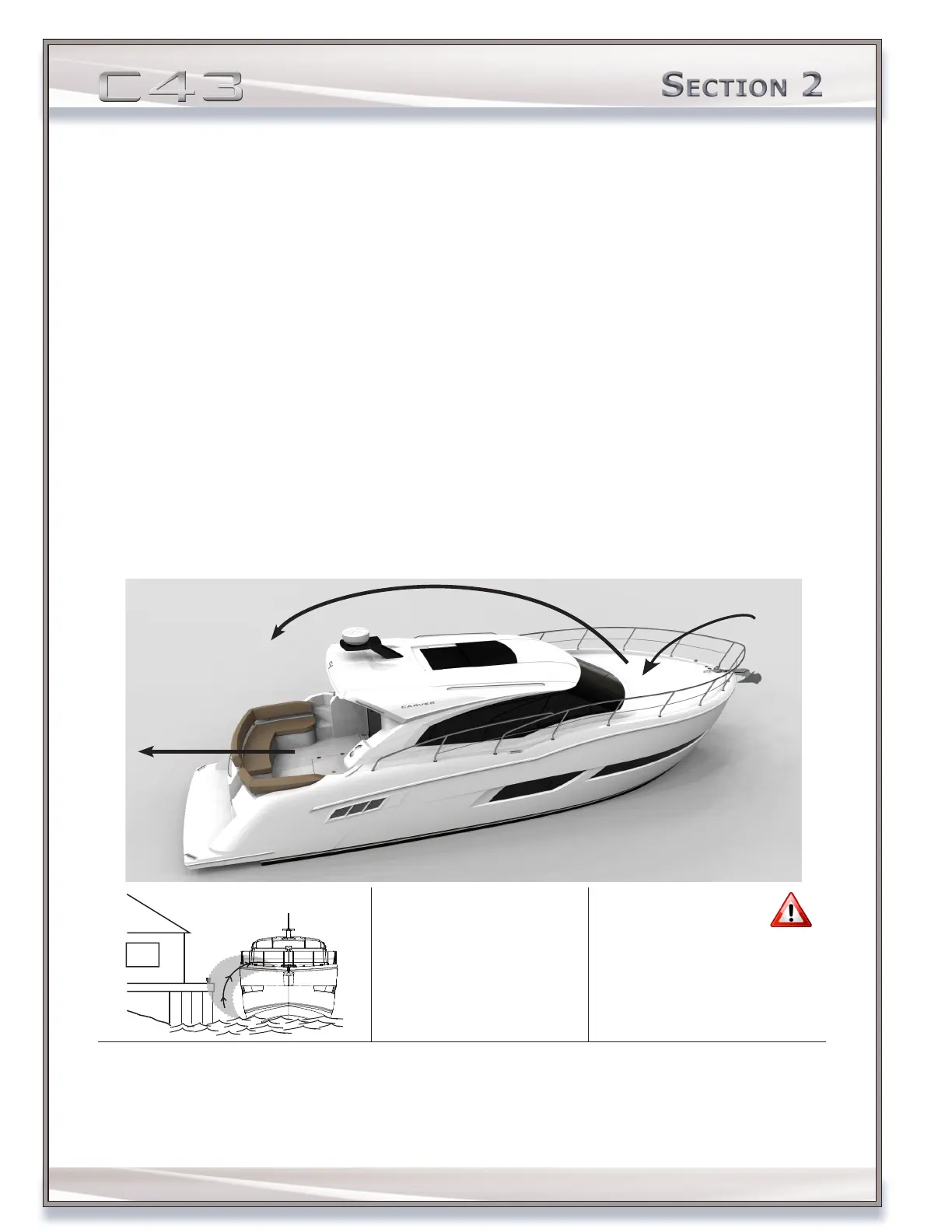 • Never occupy aft lounging areas, including the boarding platform. Never swim near the engine or generator exhaust outlets