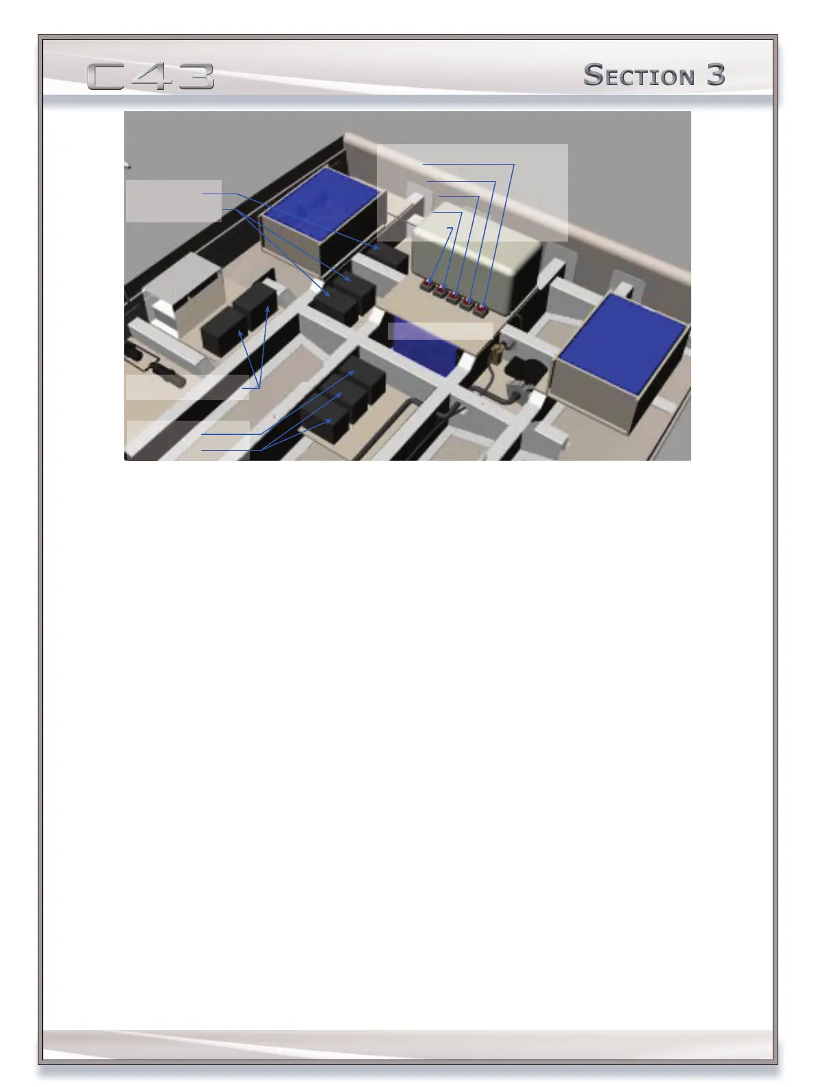The DC control center manages the power supply to the DC components listed on the panel. The C43 contains a single