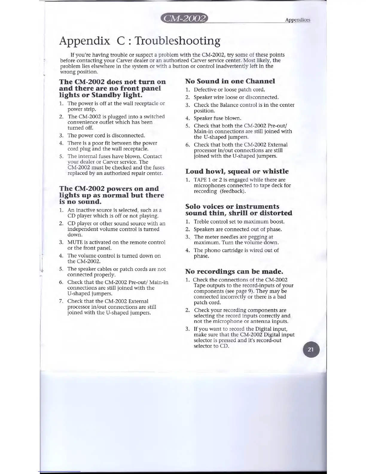 before contacting your Carver dealer or an authorized Carver service center. Most likely, the