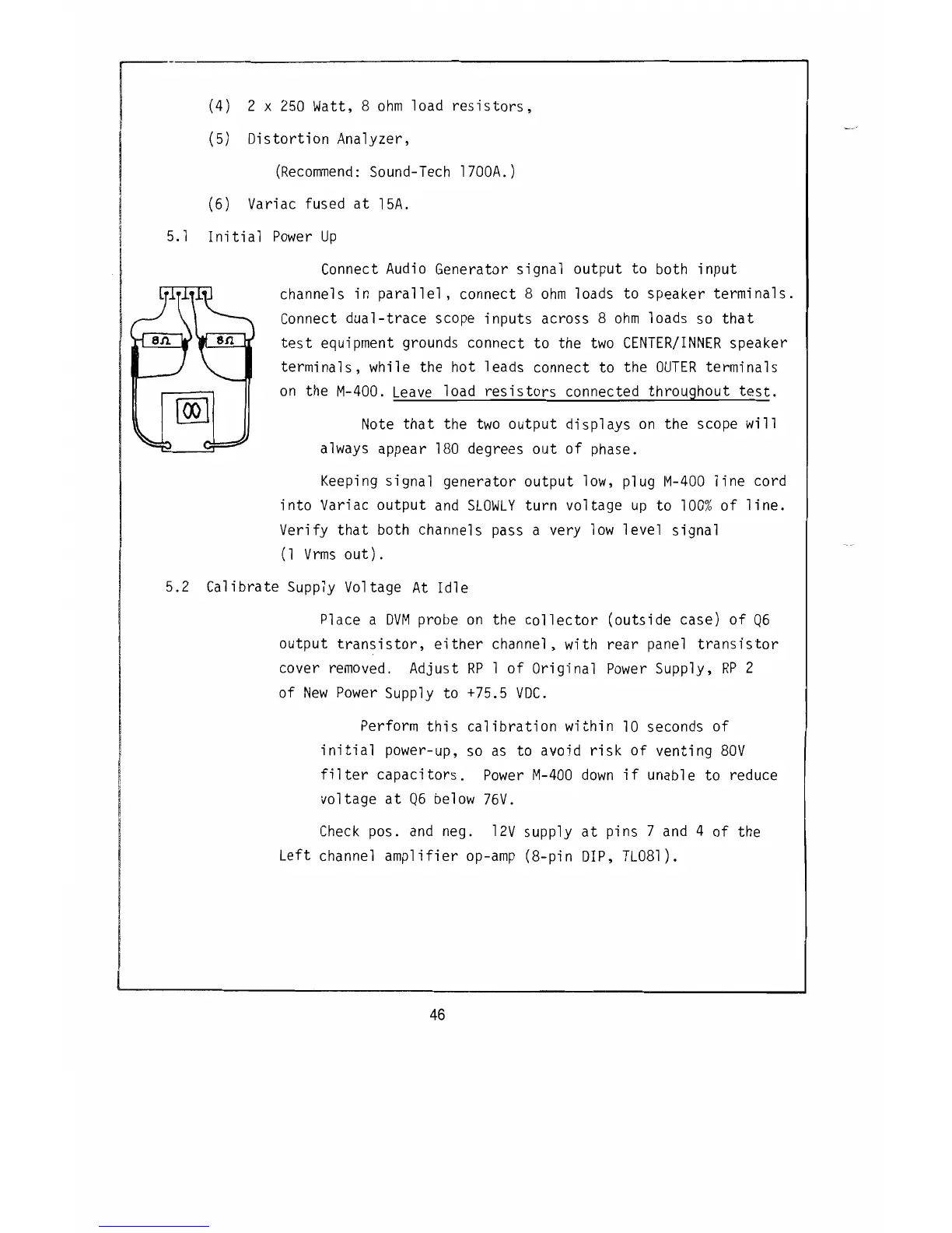 Carver M-400A - Initial Power Up; Calibrate Supply Voltage At Idle