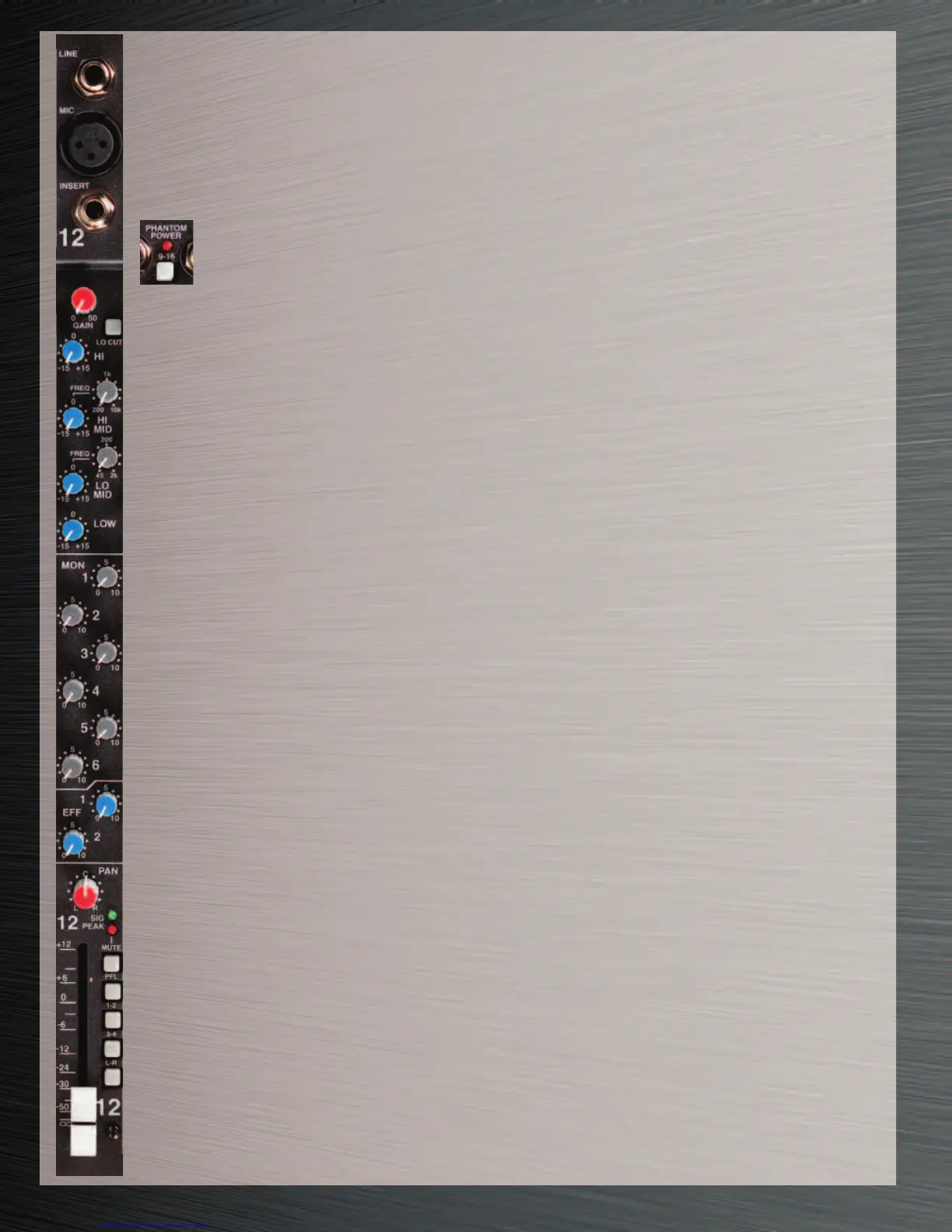CHANNEL RED PEAK LED is pre-fader and post EQ. A “solid” lit PEAK LED indicates a muted channel.