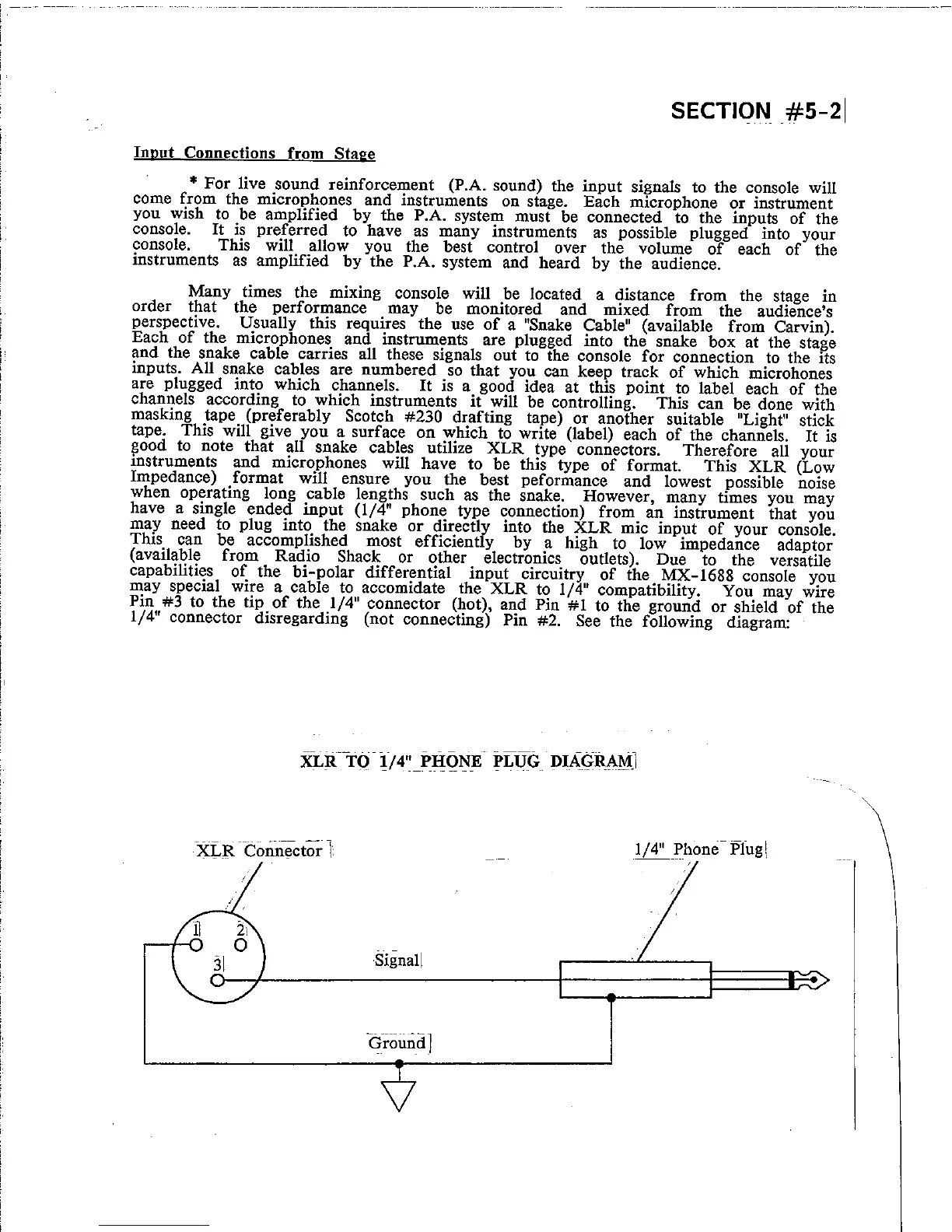 CARVIN MX 2488 - Input Connections from Stage; XLR to 1;4 Phone Plug Diagram