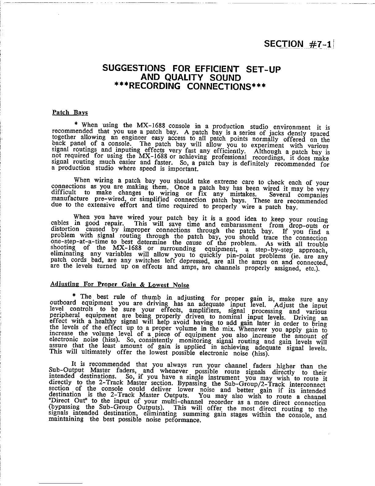 CARVIN MX 2488 - Suggestions for Efficient Set-Up and Quality Sound; Recording Connections; Patch Bays; Adjusting for Proper Gain & Lowest Noise