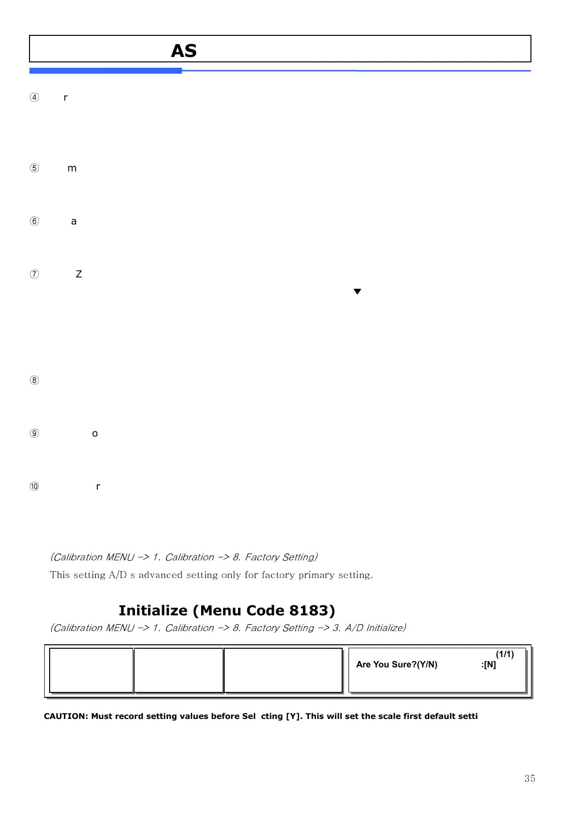 (Calibration MENU -> 1. Calibration -> 8. Factory Setting -> 3. A/D Initialize)