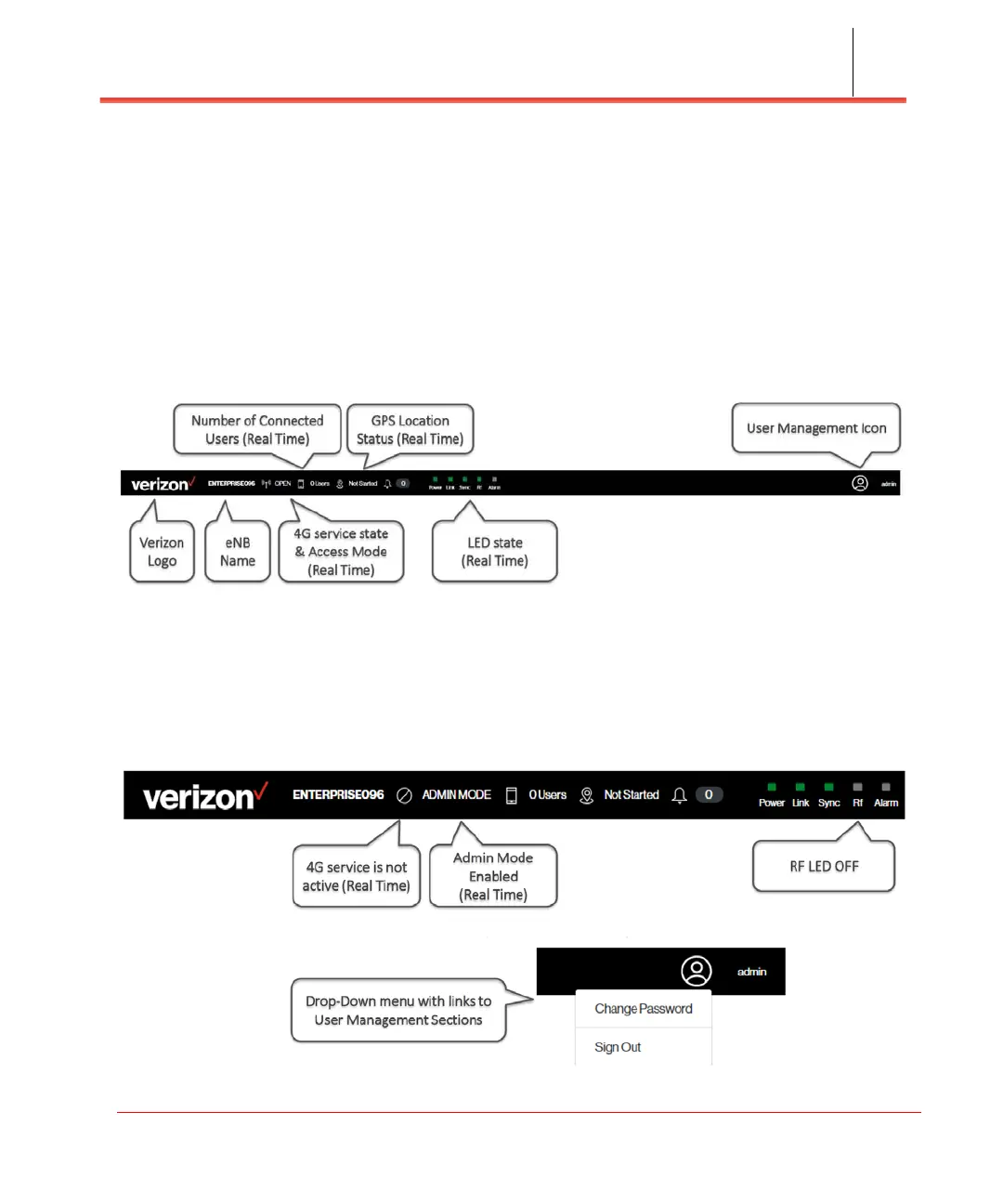 Header Bar information is common to all pages. The LEDs in the Header Bar show