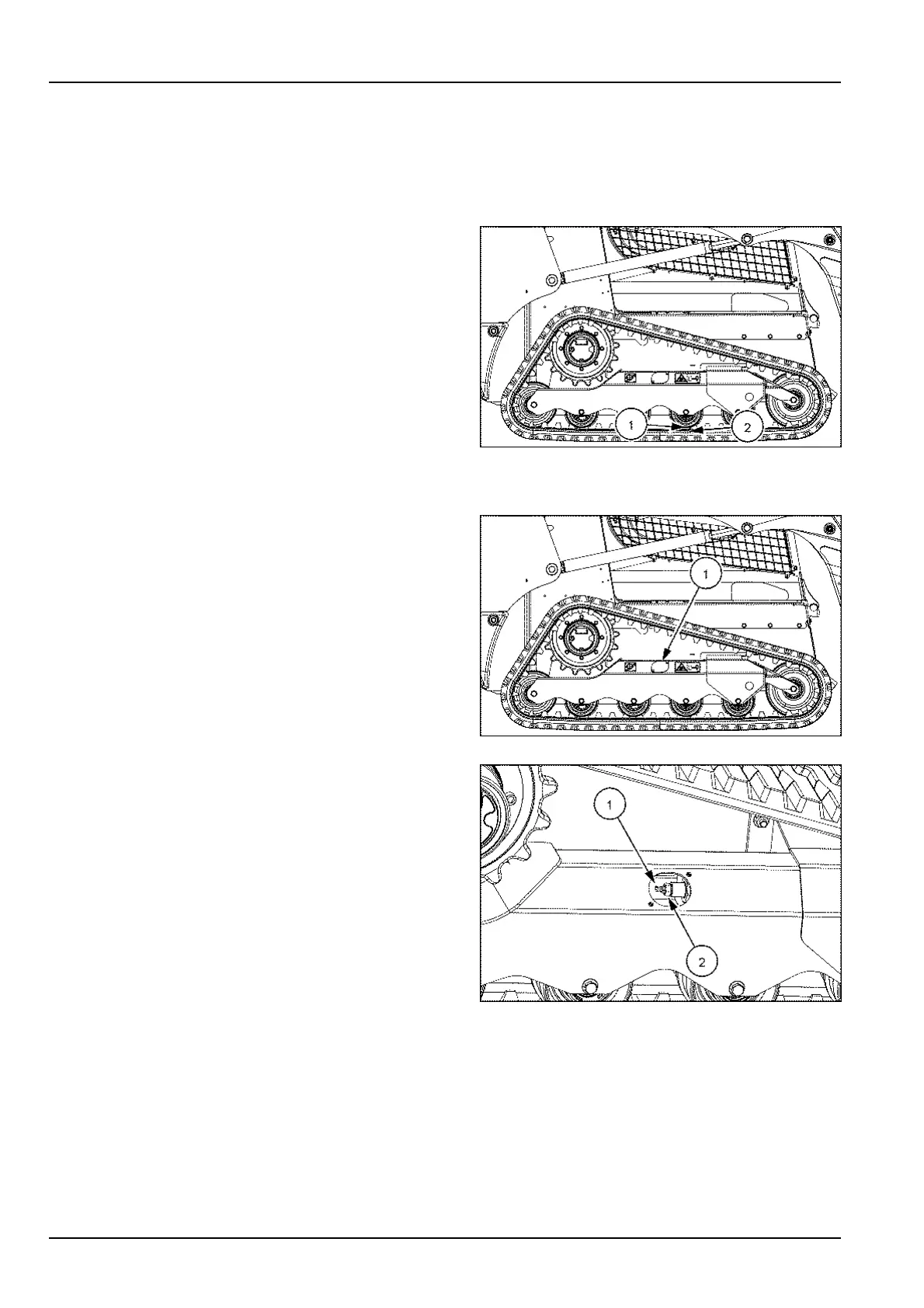 Checkthetracktensionevery50h.Forthisprocedure,thetracks,rollers,idlerwheels,debrisguard,andnaldrive