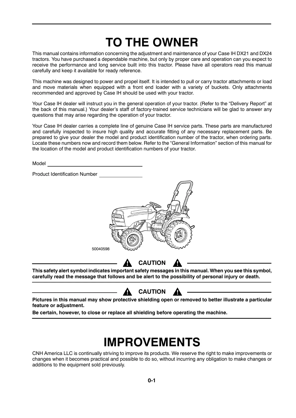 This manual contains information concerning the adjustment and maintenance of your Case IH DX21 and DX24