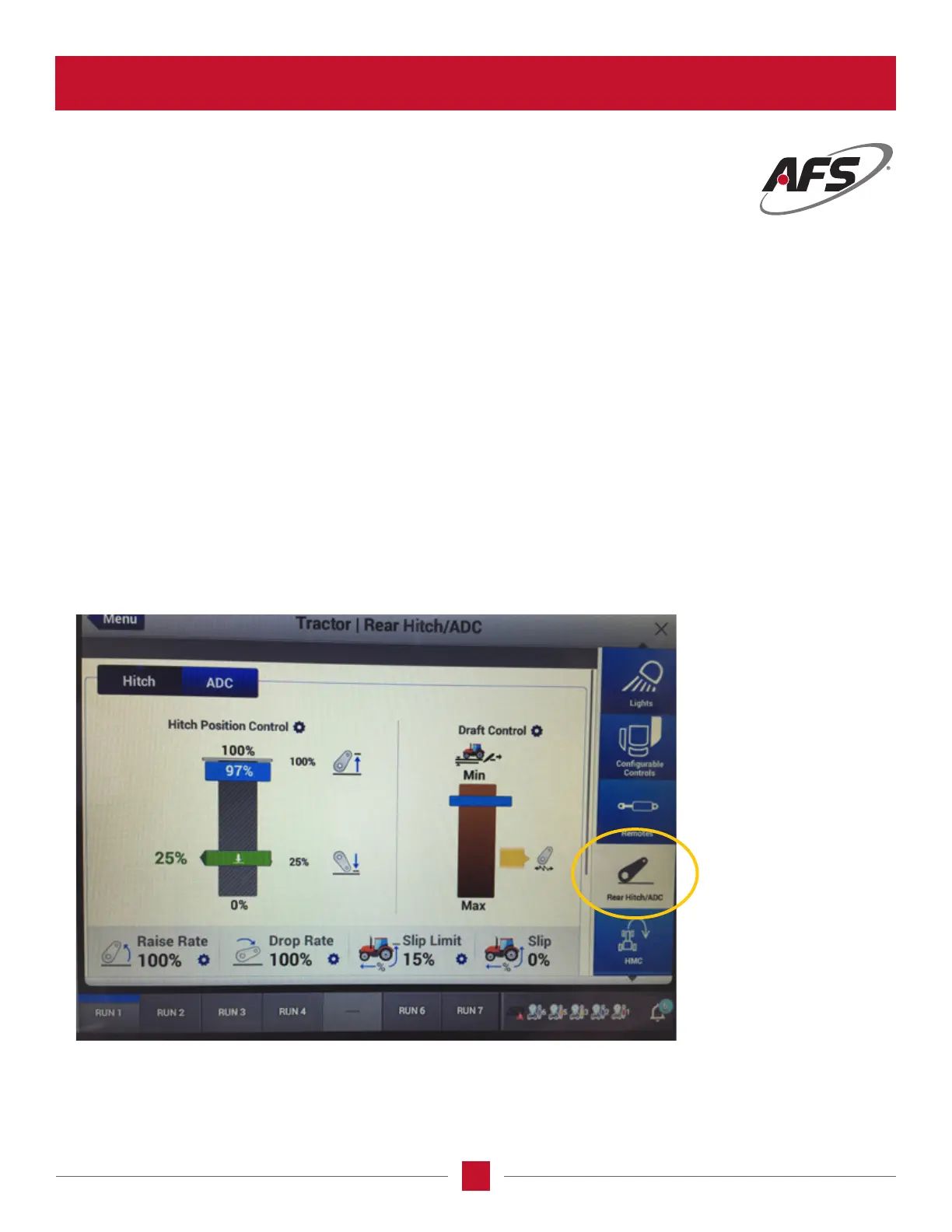 • Set the draft control using the knobs on the armrest, and display on the Vehicle Settings page, tractor menu choice, and