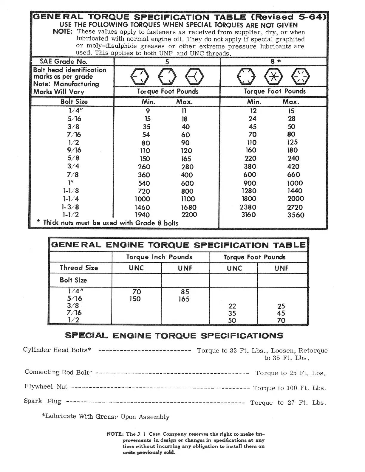 SPECIAL ENGINE TORQUE SPECIFICATIONS