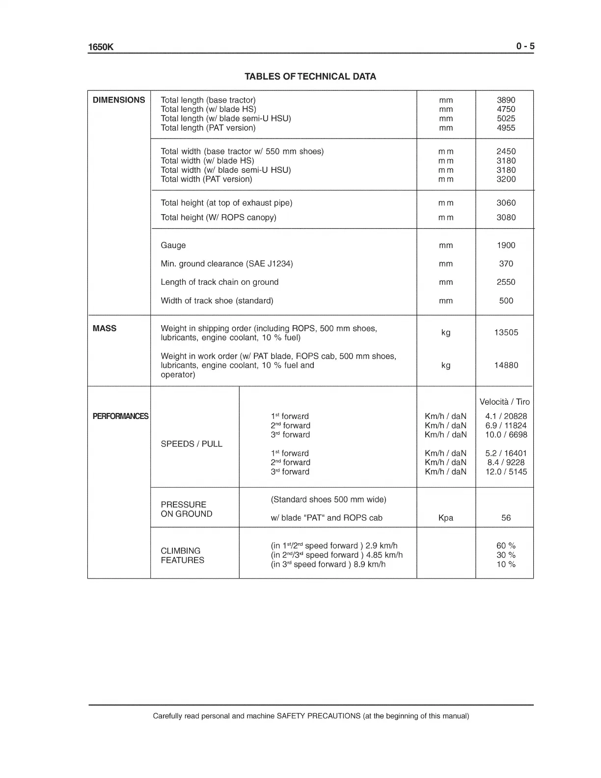 MASS Weight in shipping order (including ROPS, 500 mm shoes,