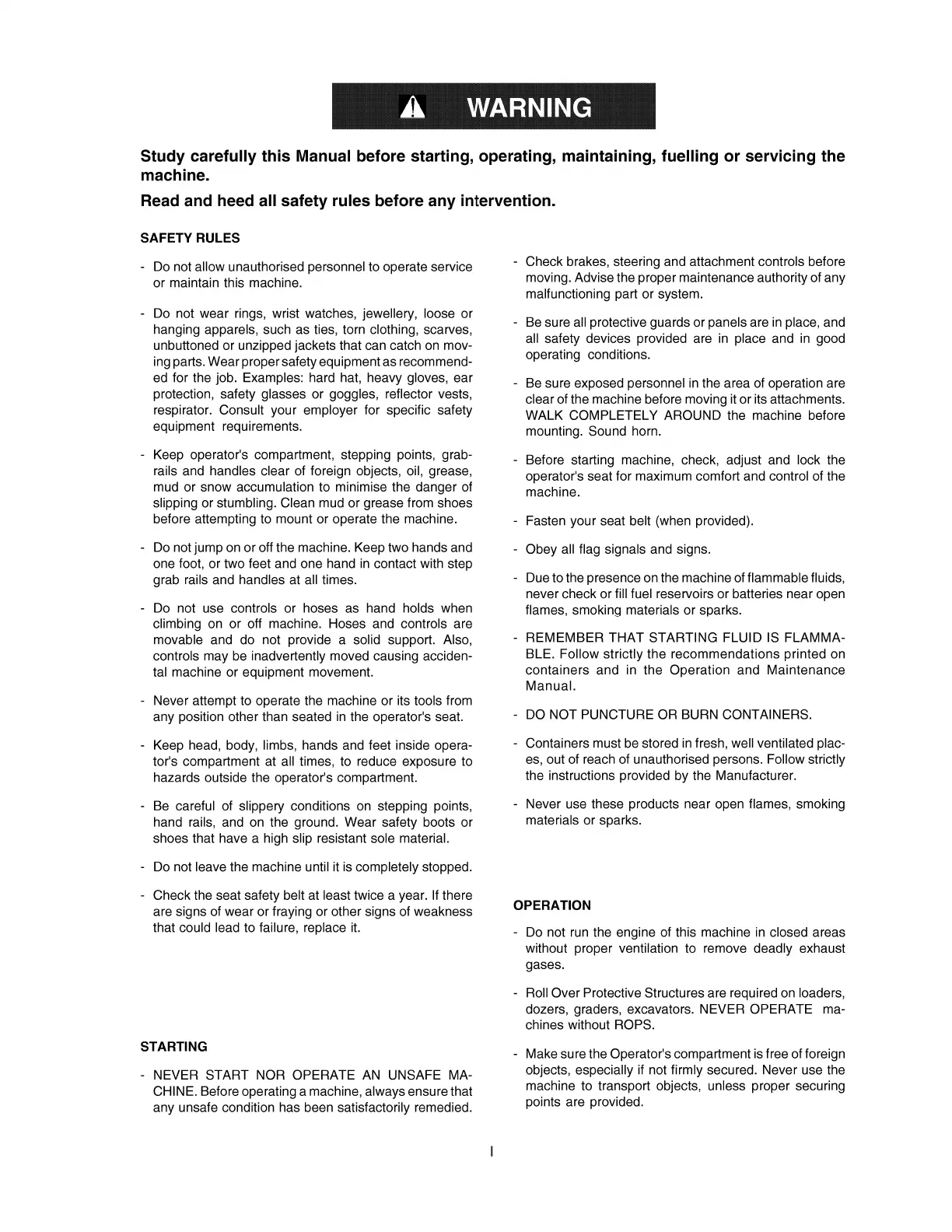Study carefully this Manual before starting, operating, maintaining, fuelling or servicing the