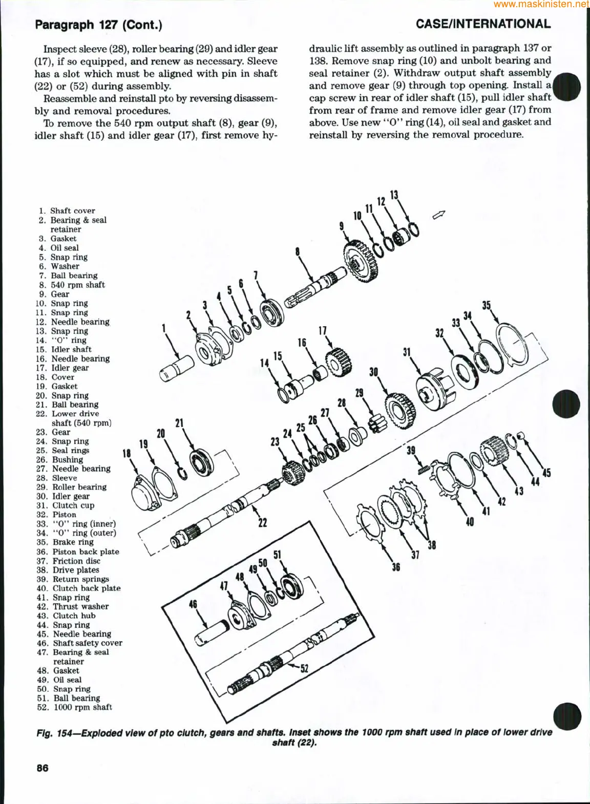 Fig. 154—Exploded view of pto clutch, gears and shafts. Inset shows the 1000 rpm shaft used In place of lower drive