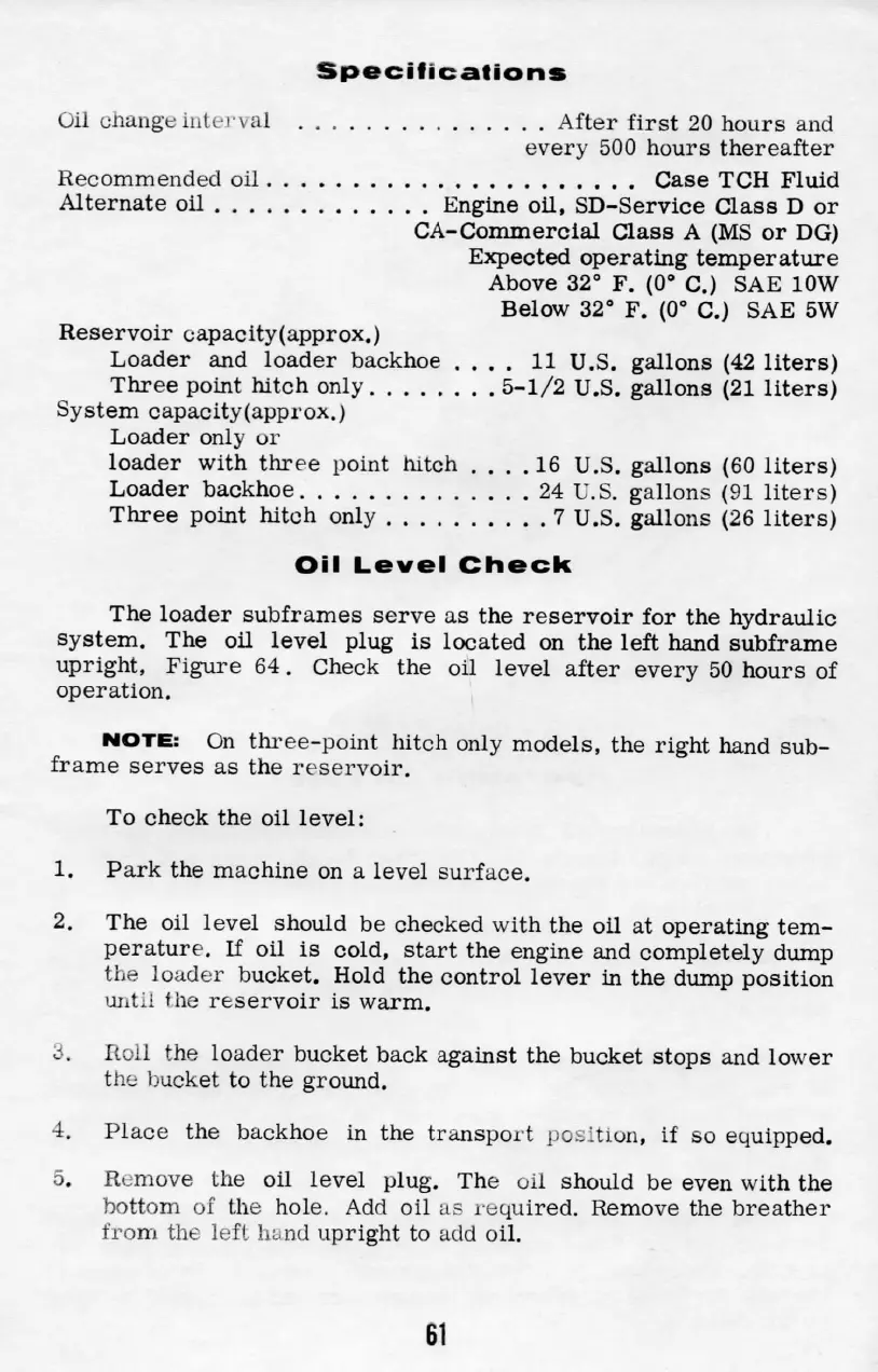 Case 580 ck - Specifications; Hydraulic Oil Specifications and Level Check