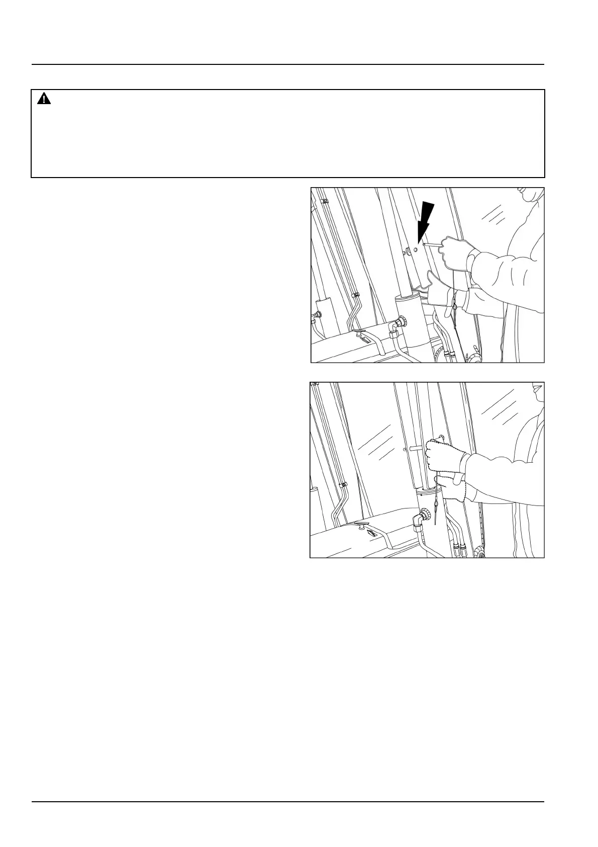 Ifyouservicethemachinewiththeloaderliftarmsraised,alwaysusethesupportstrut.Removethe