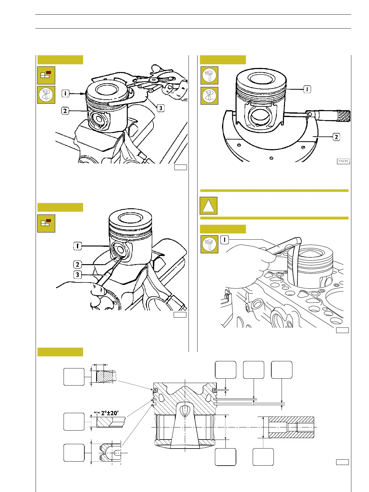 Piston pin (1) split rings (2) are removed using a scriber (3).