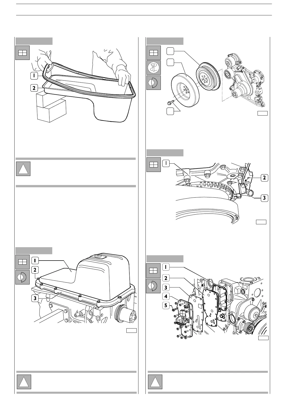 - Assemble oil pan (1), apply the plate over it (2). Tighten