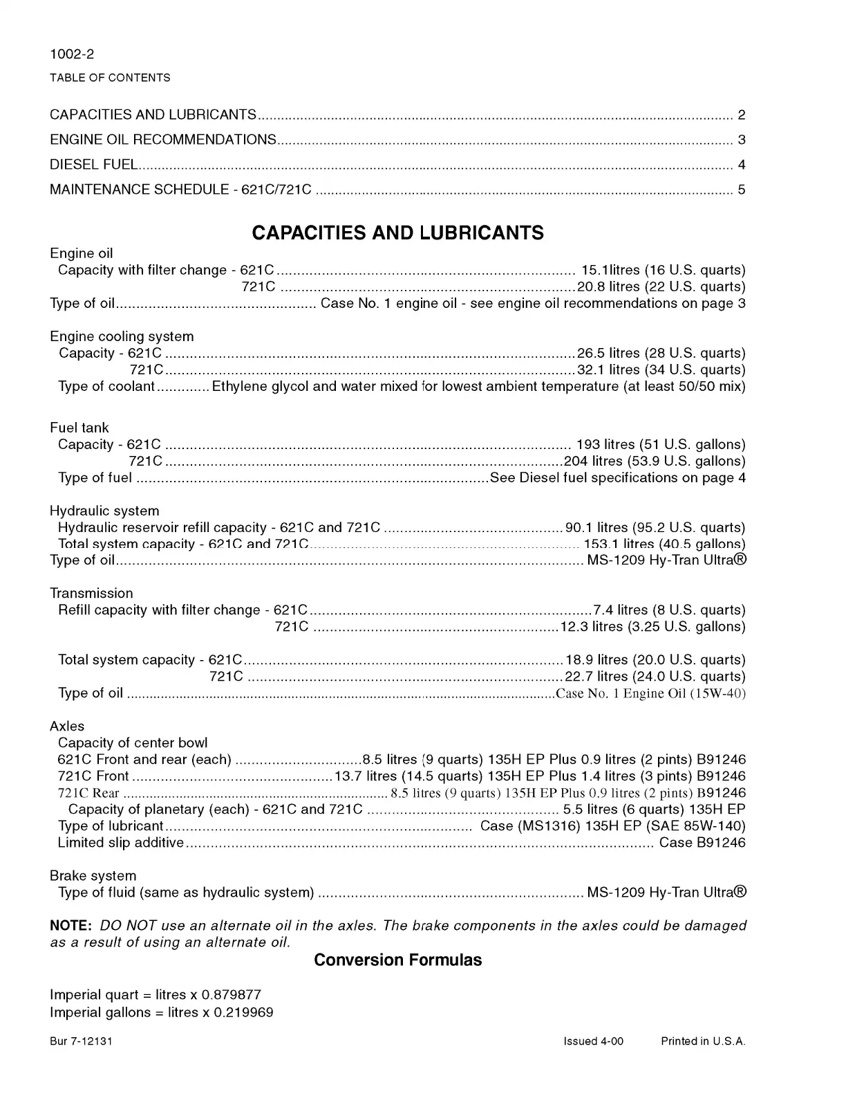 721 C Front ................................................. 13.7 litres (14.5 quarts) 135H EP Plus 1.4 litres (3 pints) B91246