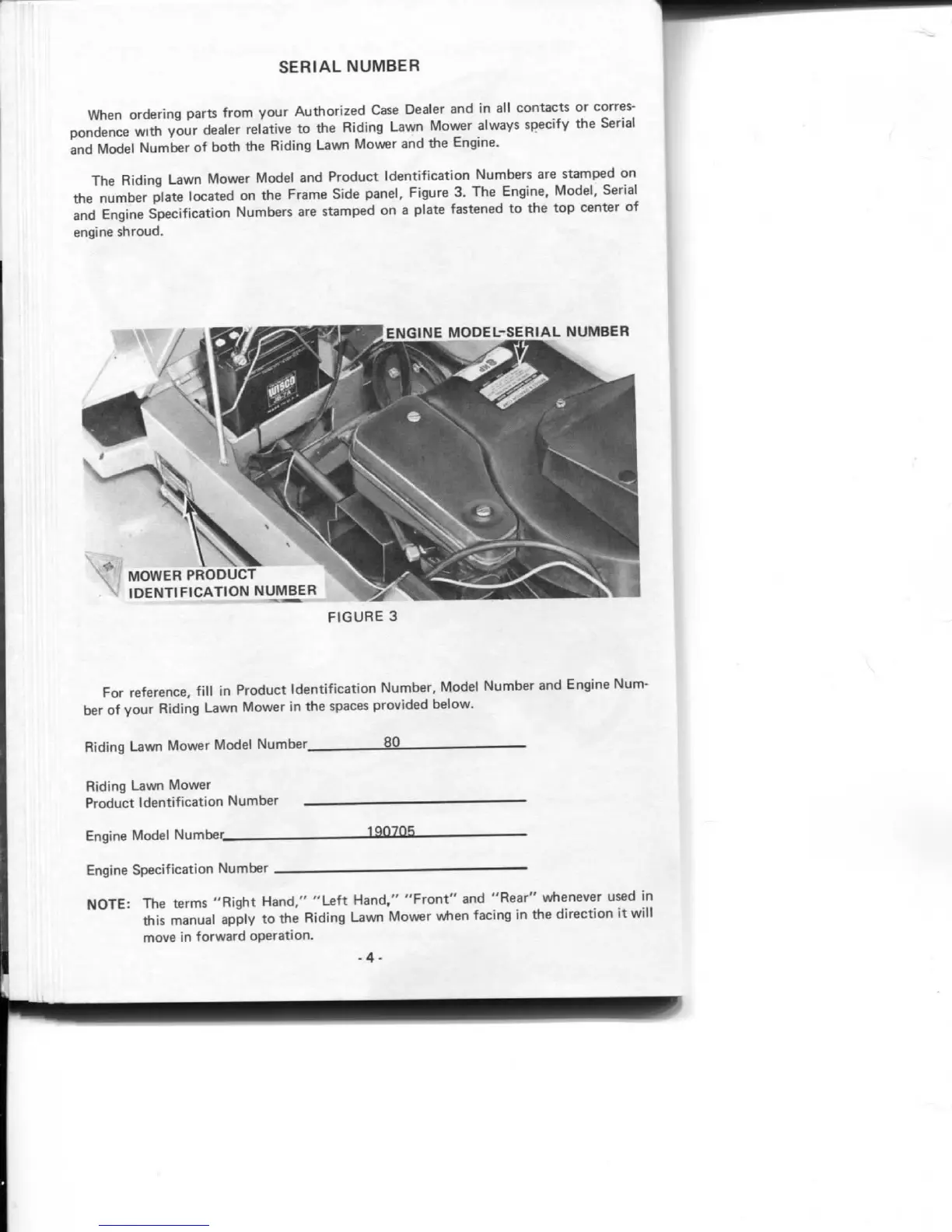 For reference, fill in Product Identification Number, Model Number and Engine Num-