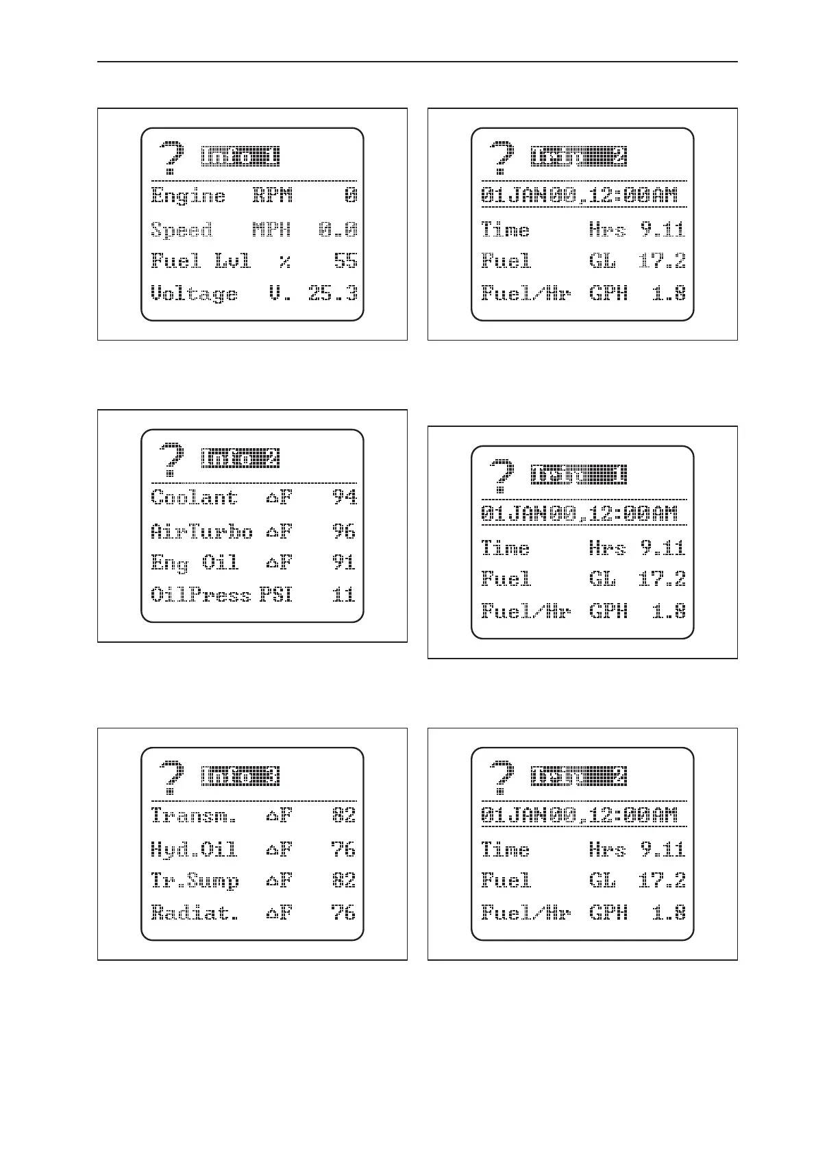 RPM’s, speed, fuel level, and the voltage level.