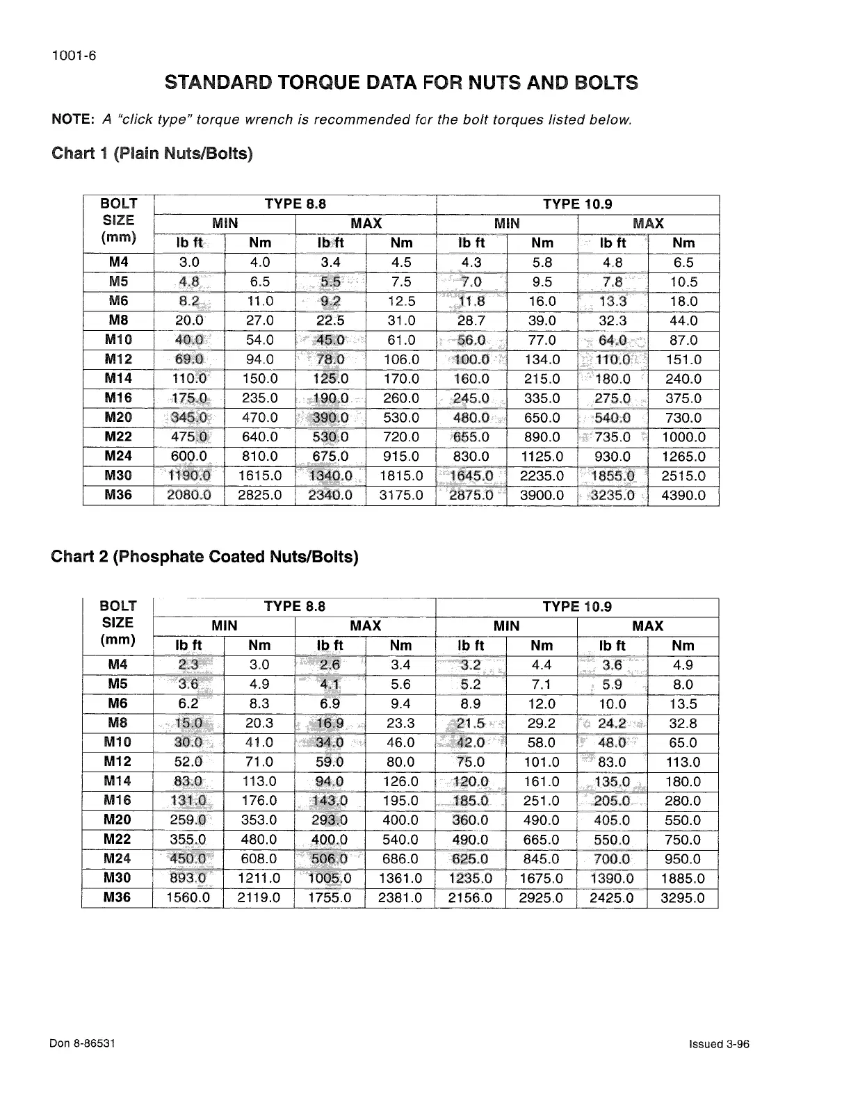 STANDARD TORQUE DATA FOR NUTS AND BOLTS