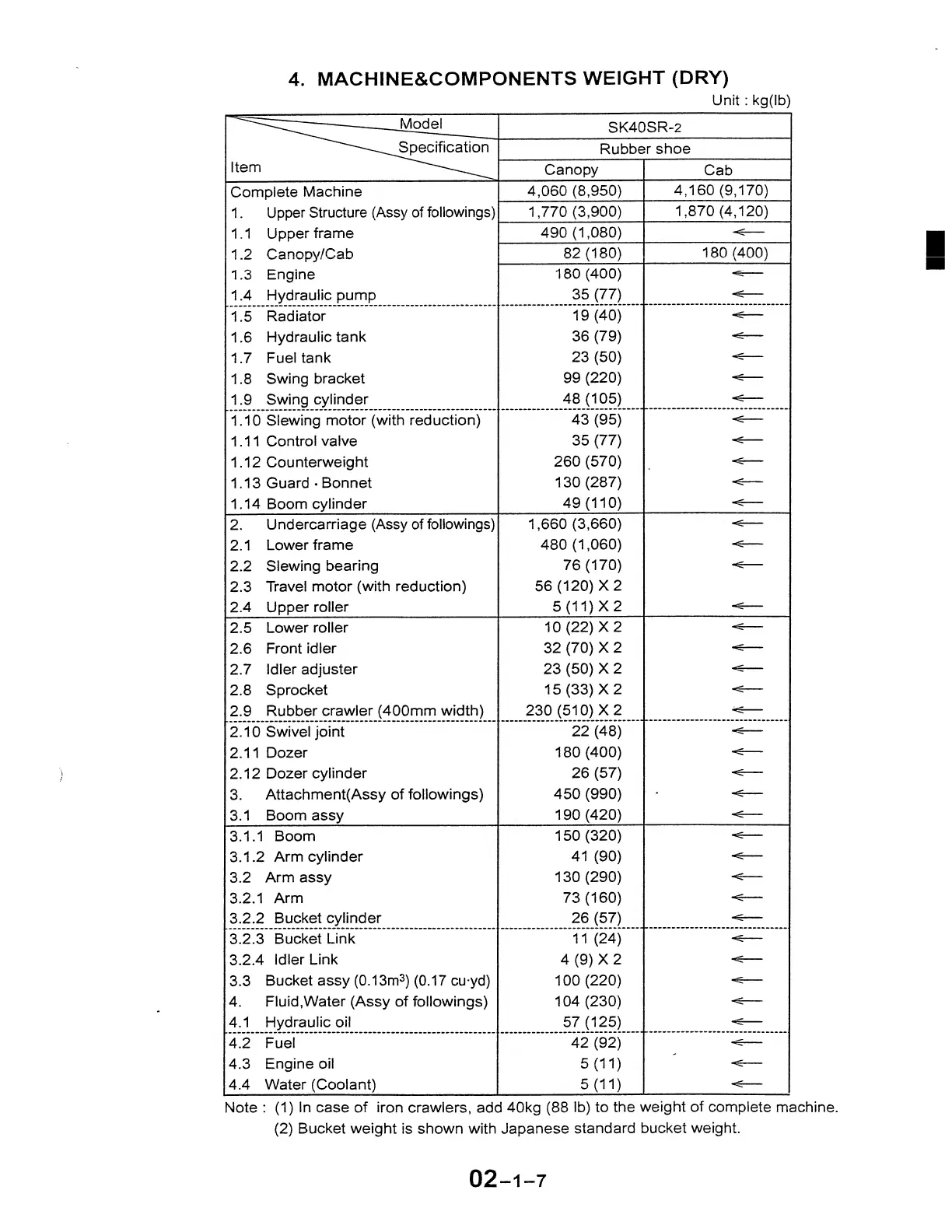 Note : (1) In case of iron crawlers, add 40kg (88 lb) to the weight of complete machine.