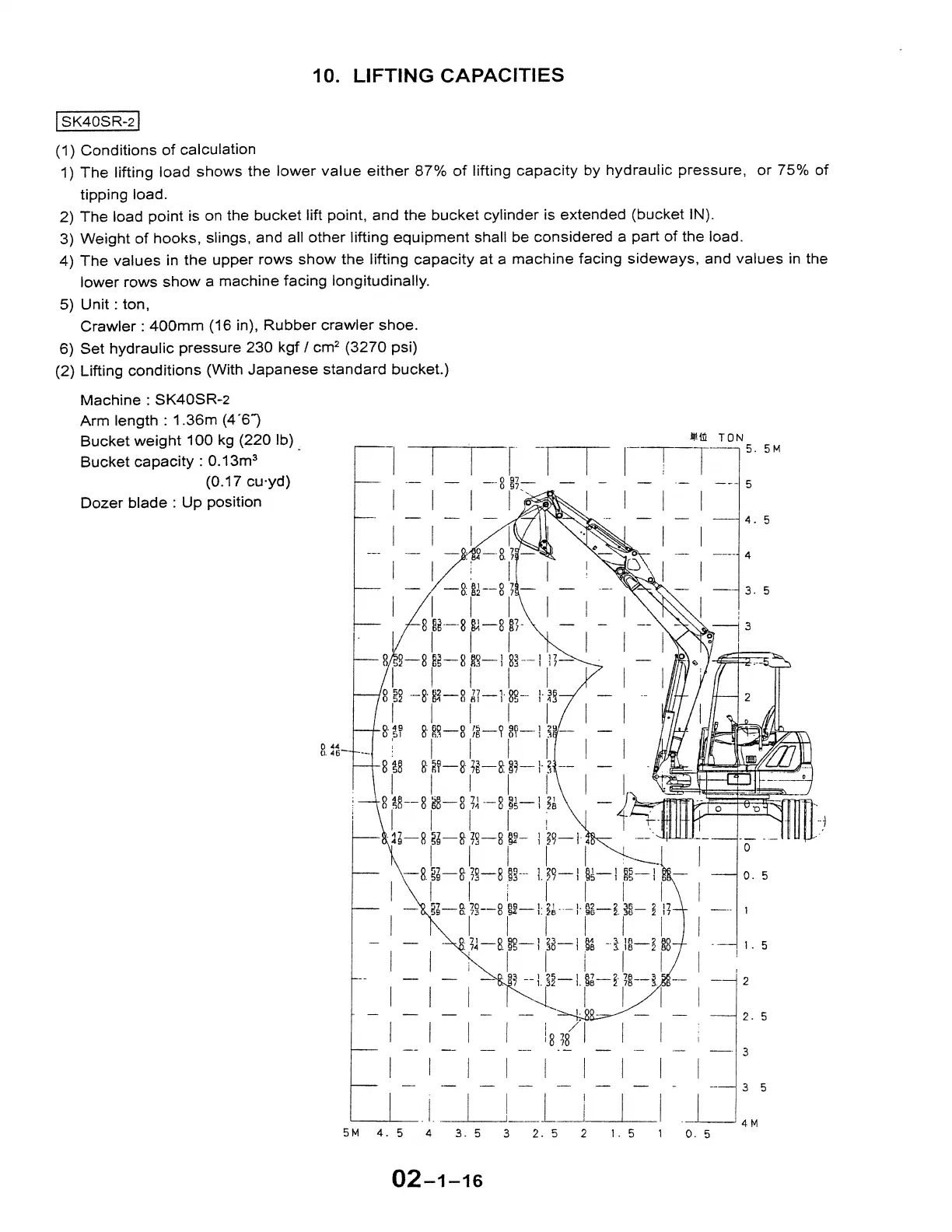 4) The values in the upper rows show the lifting capacity at a machine facing sideways, and values in the