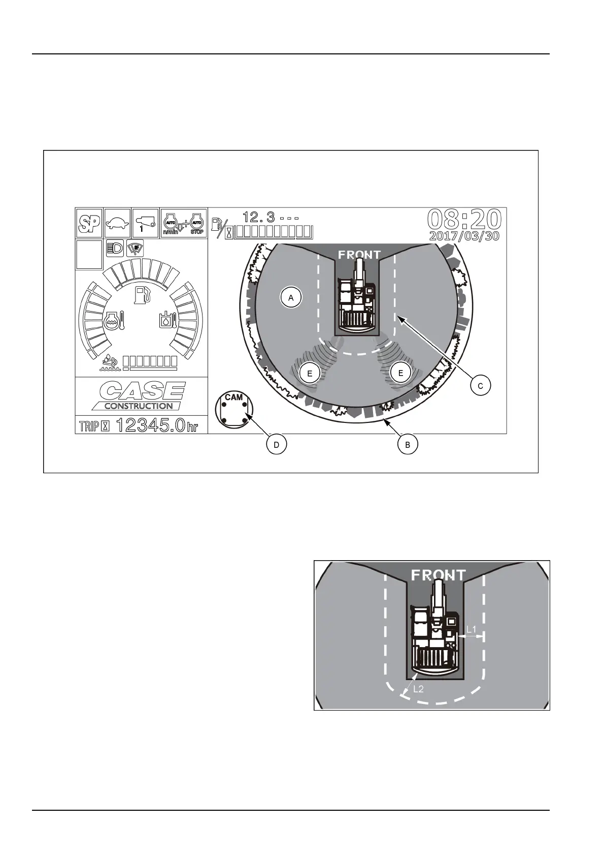 NOTE:Thezones(E)wheretheviewoftherearcameraiscombinedwiththeviewsofthesidecamerasareaffected