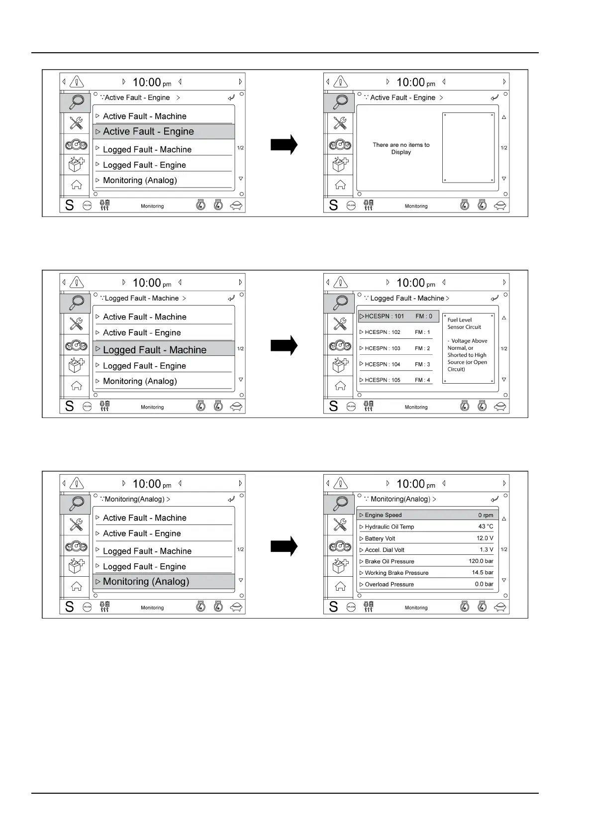 ThemachinestatussuchastheengineRPM,theoiltemperature,thevoltage,thepressure,etc.canbecheckedby