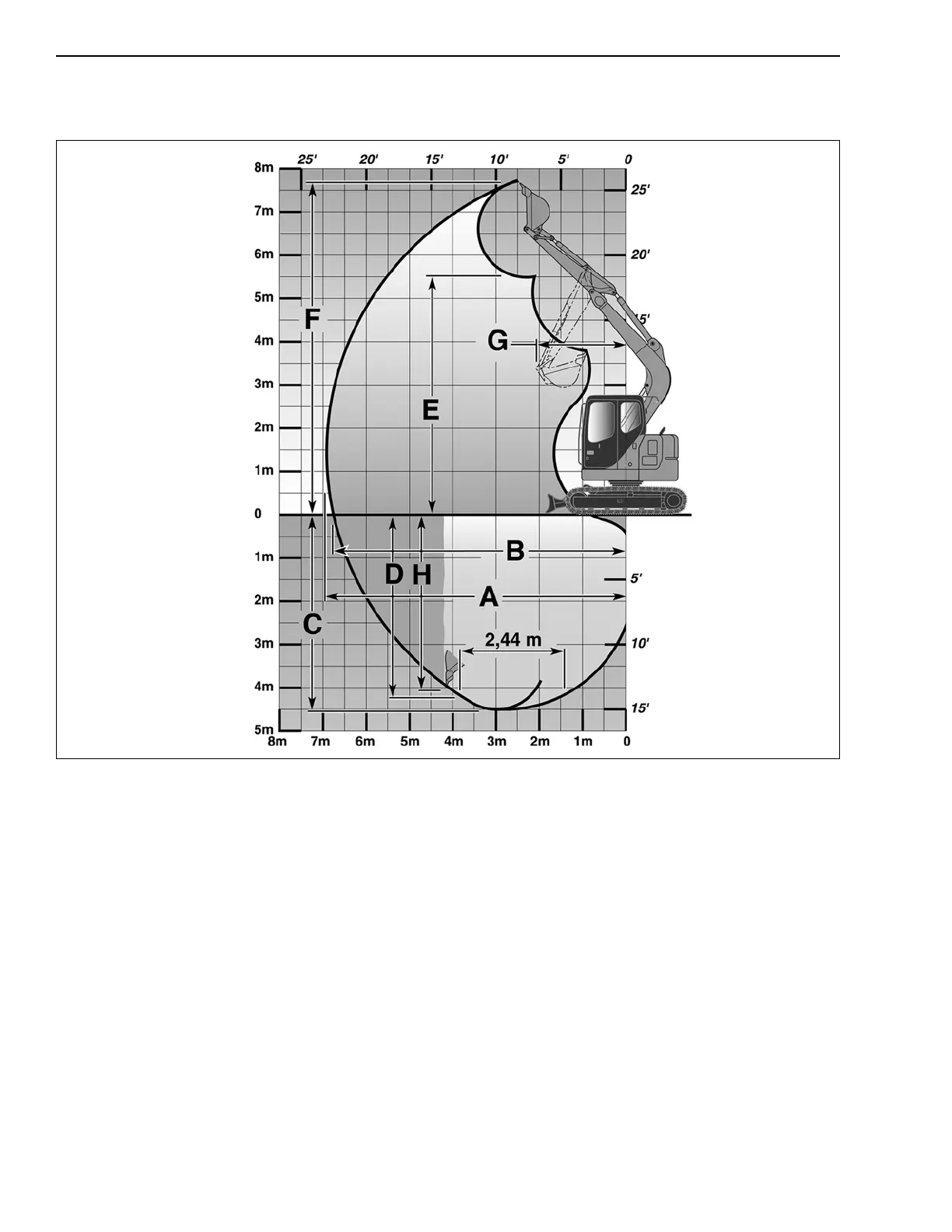 D. Maximum digging depth over a length of 2.44 m (8 ft.)........................................................... 3.80 m (12 ft. 6 in)